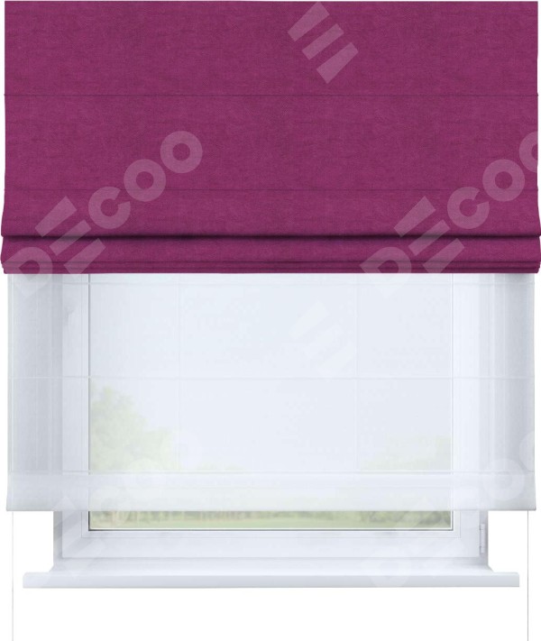 Римская штора день-ночь производителя «Cortin», используется для проёма, пошита из двух полотен, с лицевой стороны вельвет фиолетовый артикул 85552, вторая ткань тюль (по стандарту комплектуется тюль белого цвета артикул V-01). Имеет универсальный механизм и подходит для монтажа: на потолок, на стену и в нишу.