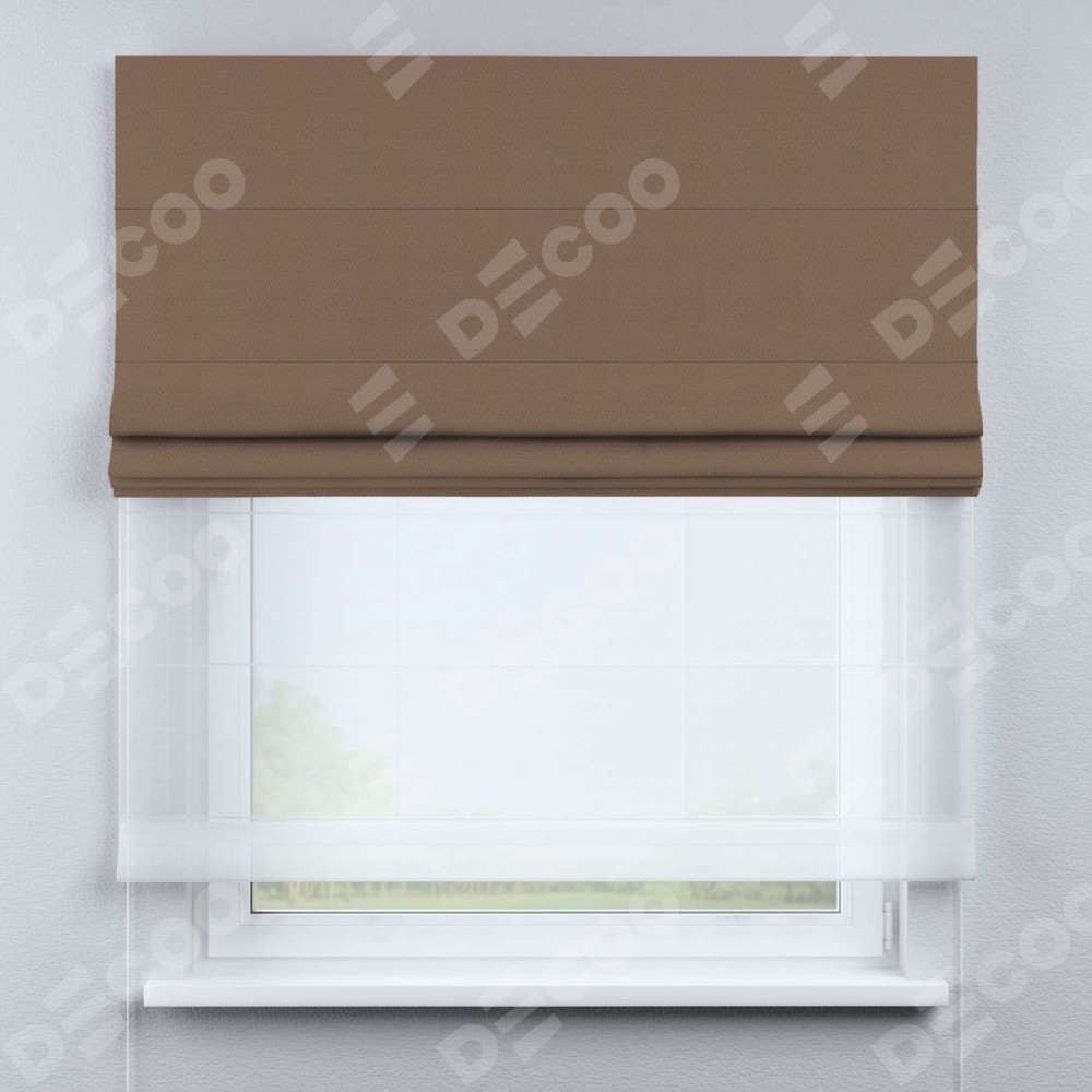 Римская штора день-ночь производителя «Cortin», используется для проёма, пошита из двух полотен, с лицевой стороны блэкаут однотонный коричневый артикул 88285, вторая ткань тюль (по стандарту комплектуется тюль белого цвета артикул V-01). Имеет универсальный механизм и подходит для монтажа: на потолок, на стену и в нишу.
