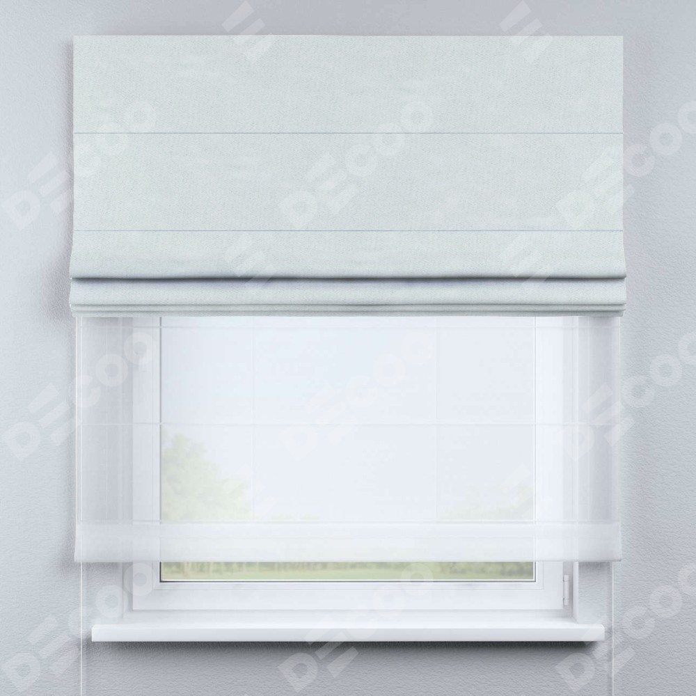 Римская штора день-ночь производителя «Cortin», используется для проёма, пошита из двух полотен, с лицевой стороны блэкаут однотонный дымчато-молочный артикул 88282, вторая ткань тюль (по стандарту комплектуется тюль белого цвета артикул V-01). Имеет универсальный механизм и подходит для монтажа: на потолок, на стену и в нишу.
