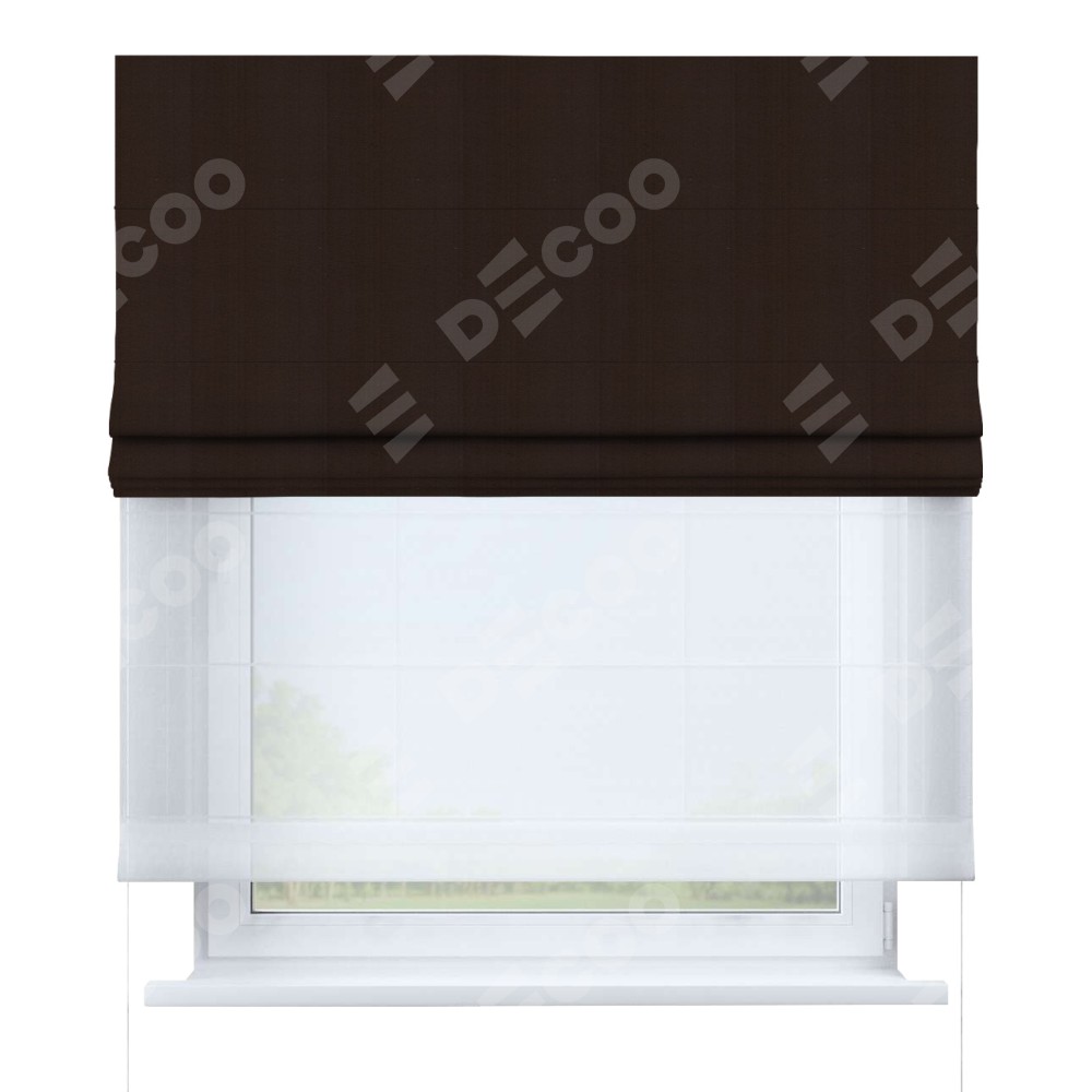 Римская штора день-ночь производителя «Cortin», используется для проёма, пошита из двух полотен, с лицевой стороны блэкаут однотонный тёмно-коричневый артикул 88287, вторая ткань тюль (по стандарту комплектуется тюль белого цвета артикул V-01). Имеет универсальный механизм и подходит для монтажа: на потолок, на стену и в нишу.
