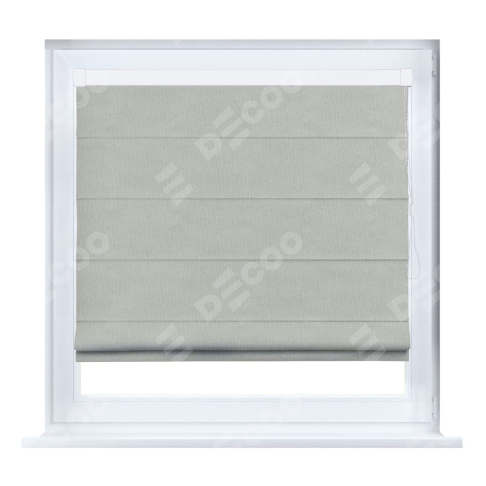 Римская штора кассетного типа, производителя «Cortin», устанавливается только на пластиковые окна и прилегает к стеклопакету, пошита из ткани лён димаут светло-серый, артикул 83025.