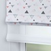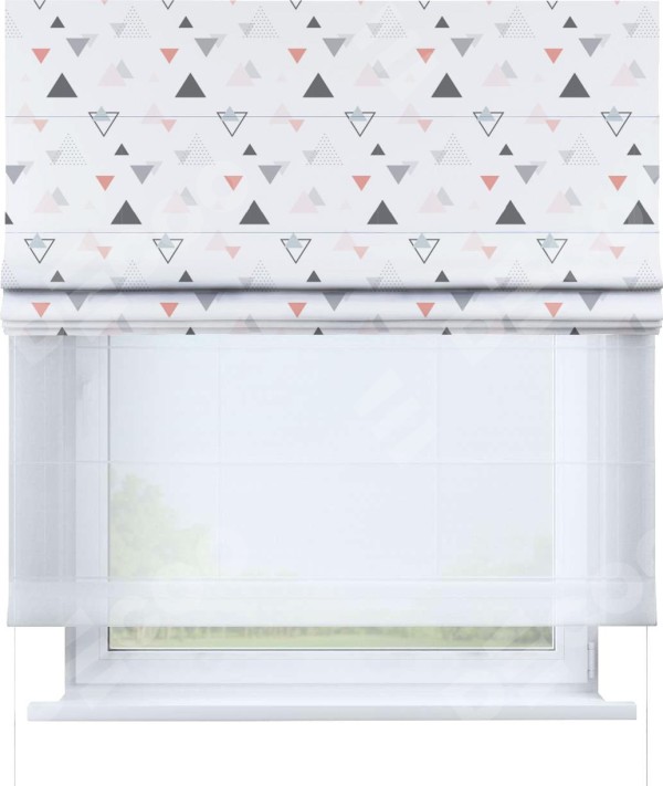 Римская штора день-ночь производителя «Cortin», используется для проёма, пошита из двух полотен, с лицевой блэкаут с нанесением сублимационной печати «Дождь из треугольников», вторая ткань тюль (по стандарту комплектуется тюль белого цвета артикул V-01). Имеет универсальный механизм и подходит для монтажа: на потолок, на стену и в нишу.