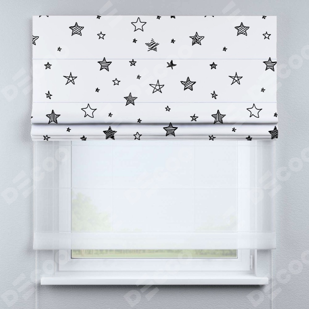 Римская штора день-ночь производителя «Cortin», используется для проёма, пошита из двух полотен, с лицевой блэкаут с нанесением сублимационной печати «Звёзды», вторая ткань тюль (по стандарту комплектуется тюль белого цвета артикул V-01). Имеет универсальный механизм и подходит для монтажа: на потолок, на стену и в нишу.