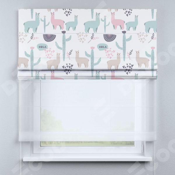 Римская штора день-ночь производителя «Cortin», используется для проёма, пошита из двух полотен, с лицевой блэкаут с нанесением сублимационной печати «Милый лама», вторая ткань тюль (по стандарту комплектуется тюль белого цвета артикул V-01). Имеет универсальный механизм и подходит для монтажа: на потолок, на стену и в нишу.