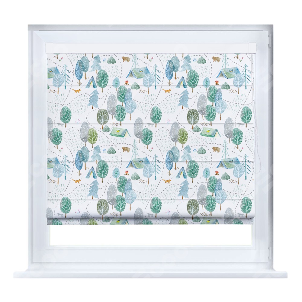 Римская штора производителя «Cortin», устанавливается на створку окна, пошита из ткани блэкаут с нанесением сублимационной печати «Лесистая местность». Штора шьётся по индивидуальным размерам, для данного типа римской шторы возможная ширина от 35 до 150 см., высота до 250 см.
