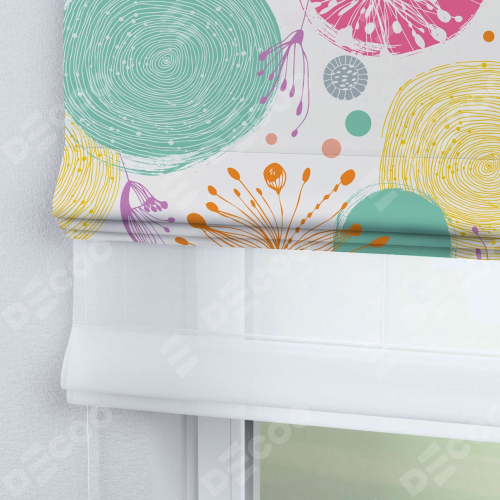 Римская штора день-ночь производителя «Cortin», используется для проёма, пошита из двух полотен, с лицевой блэкаут с нанесением сублимационной печати «Забавные детали», вторая ткань тюль (по стандарту комплектуется тюль белого цвета артикул V-01). Имеет универсальный механизм и подходит для монтажа: на потолок, на стену и в нишу.