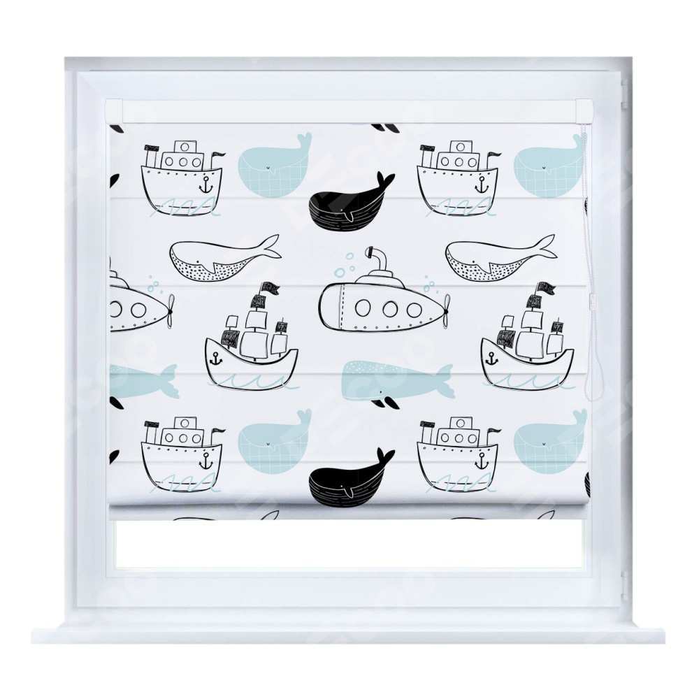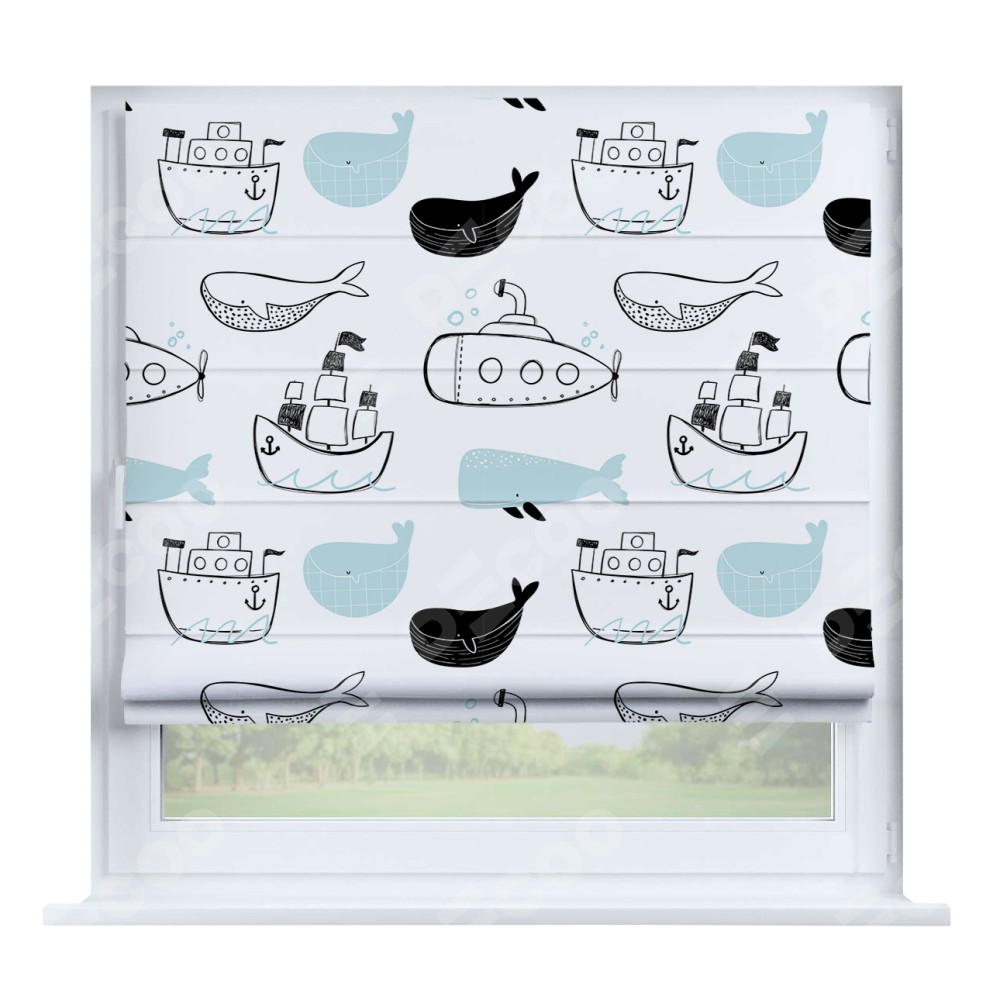 Римская штора производителя «Cortin», устанавливается на створку окна, пошита из ткани блэкаут с нанесением сублимационной печати «Морская прогулка». Штора шьётся по индивидуальным размерам, для данного типа римской шторы возможная ширина от 35 до 150 см., высота до 250 см.