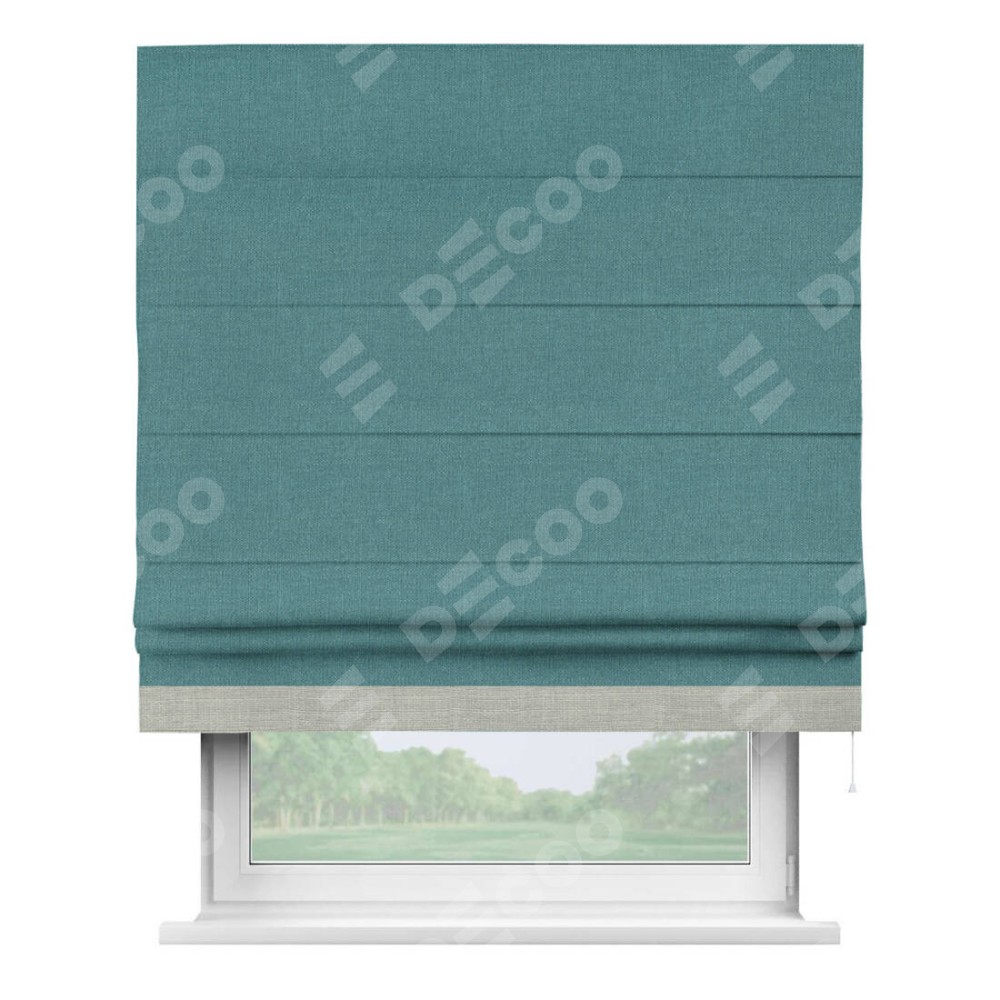 Римская штора производителя «Cortin», используется для проёма, пошита из ткани лён бирюзовый, артикул 53436. Отделка шторы кантом «Джестер», ткань для канта используется из льна разной расцветки на выбор. Имеет универсальный механизм и подходит для монтажа: на потолок, на стену и в нишу.
