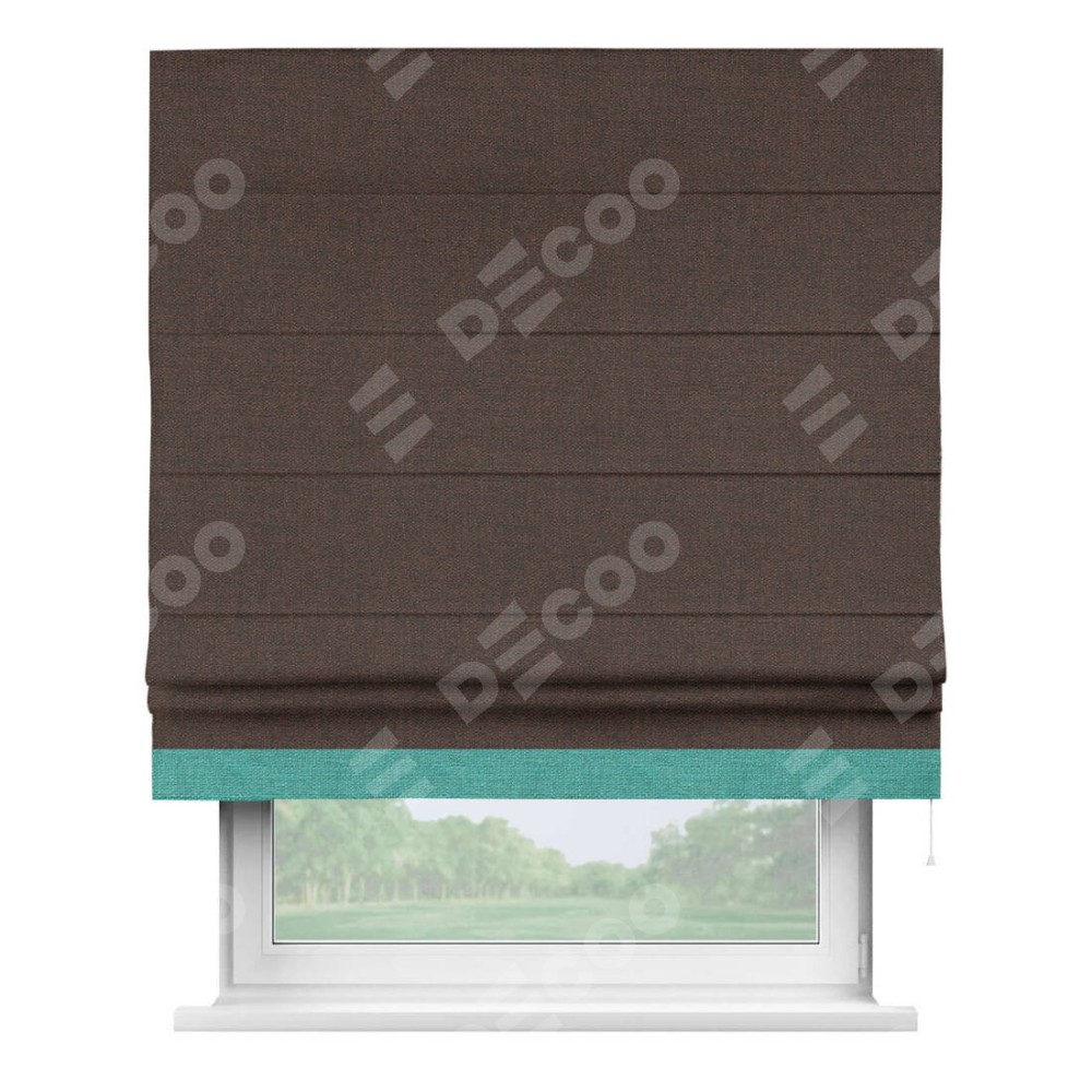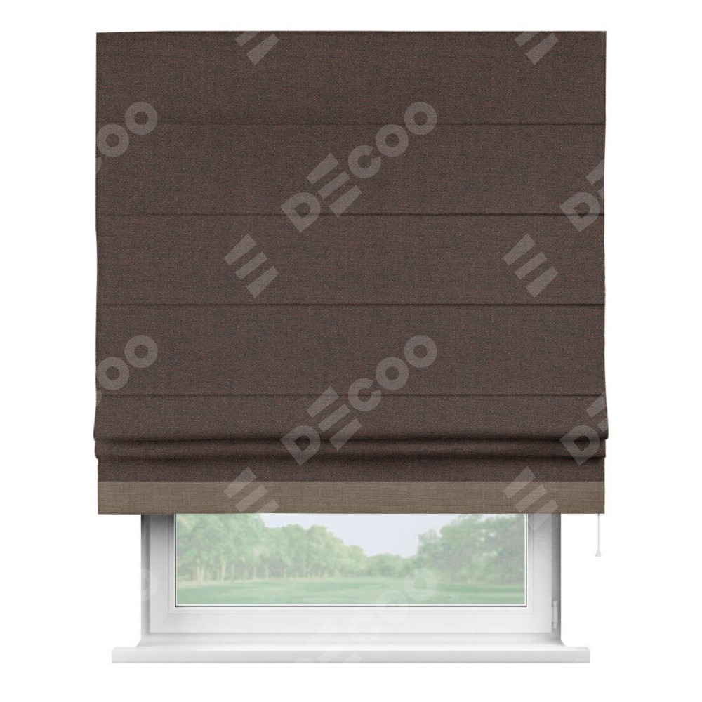 Римская штора производителя «Cortin», используется для проёма, пошита из ткани лён коричневый, артикул 53443. Отделка шторы кантом «Джестер», ткань для канта используется из льна разной расцветки на выбор. Имеет универсальный механизм и подходит для монтажа: на потолок, на стену и в нишу.