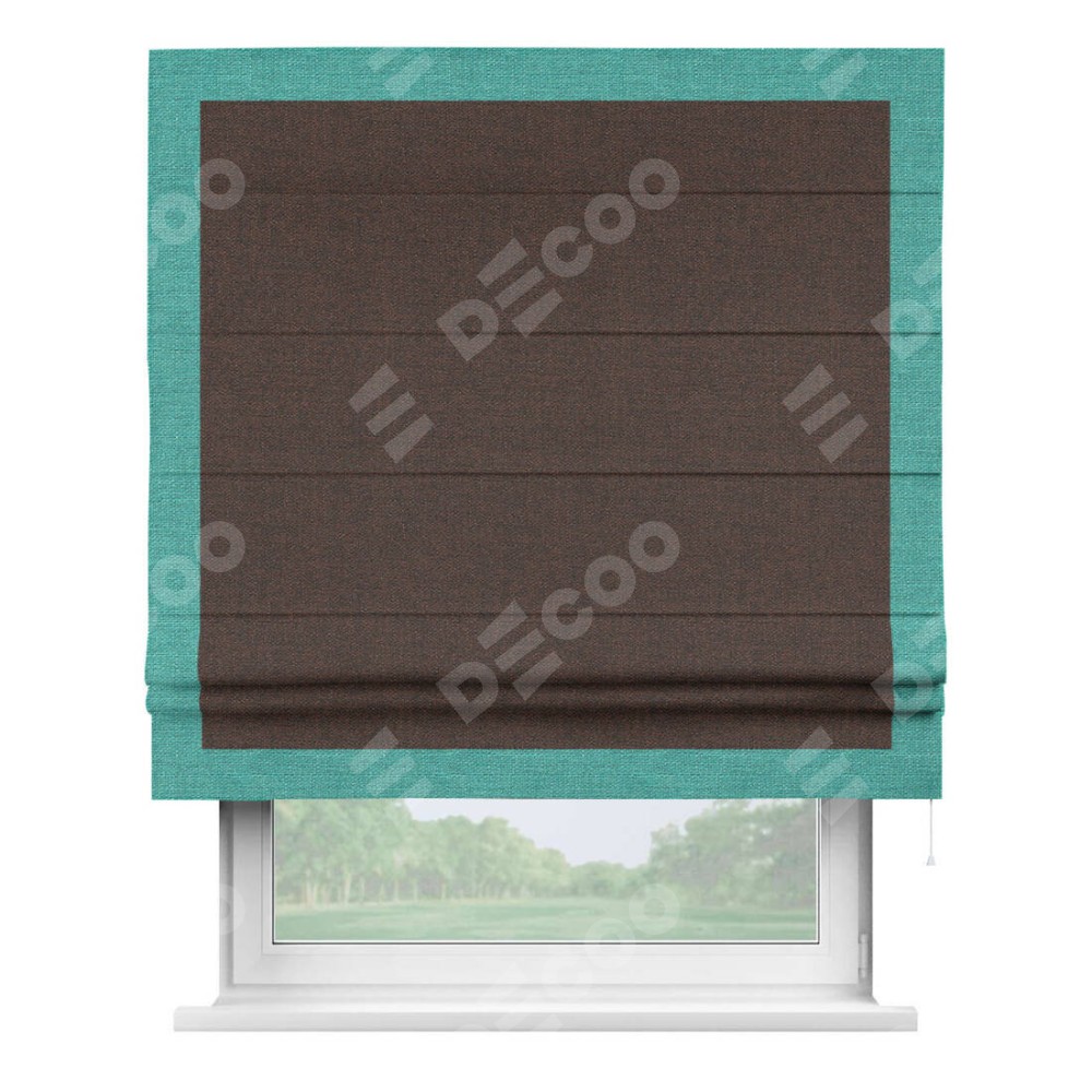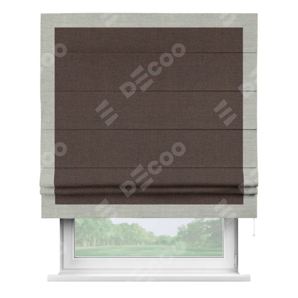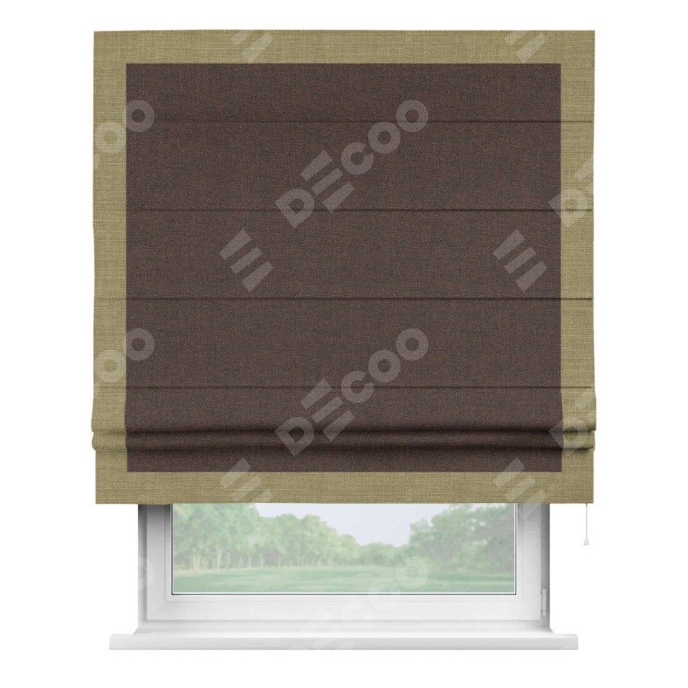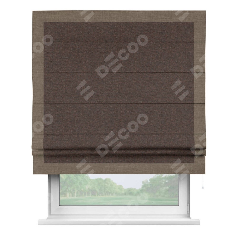 Римская штора производителя «Cortin», используется для проёма, пошита из ткани лён коричневый, артикул 53443. Отделка шторы кантом «Чесс», ткань для канта используется из льна разной расцветки на выбор. Имеет универсальный механизм и подходит для монтажа: на потолок, на стену и в нишу.