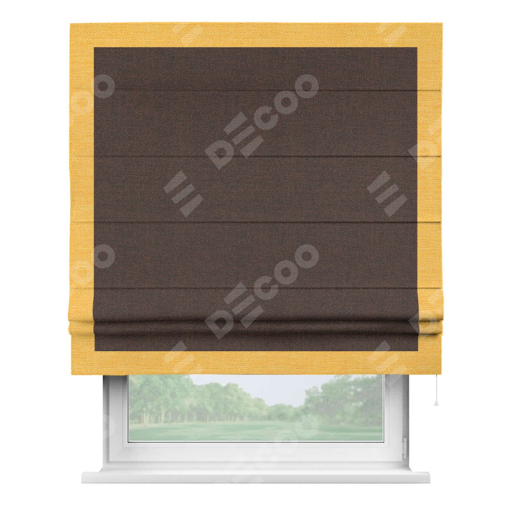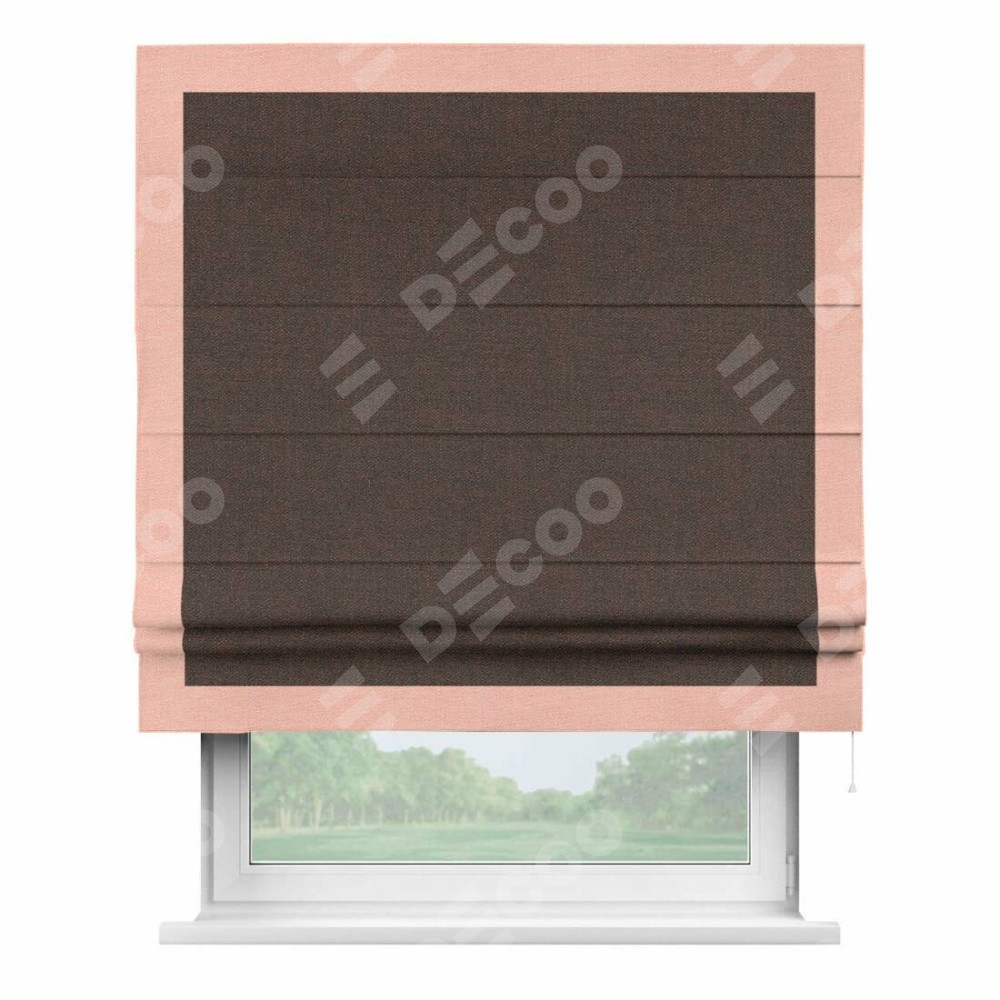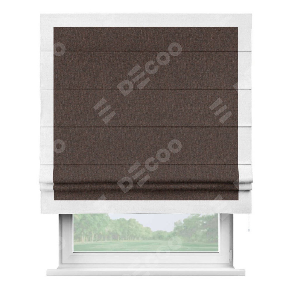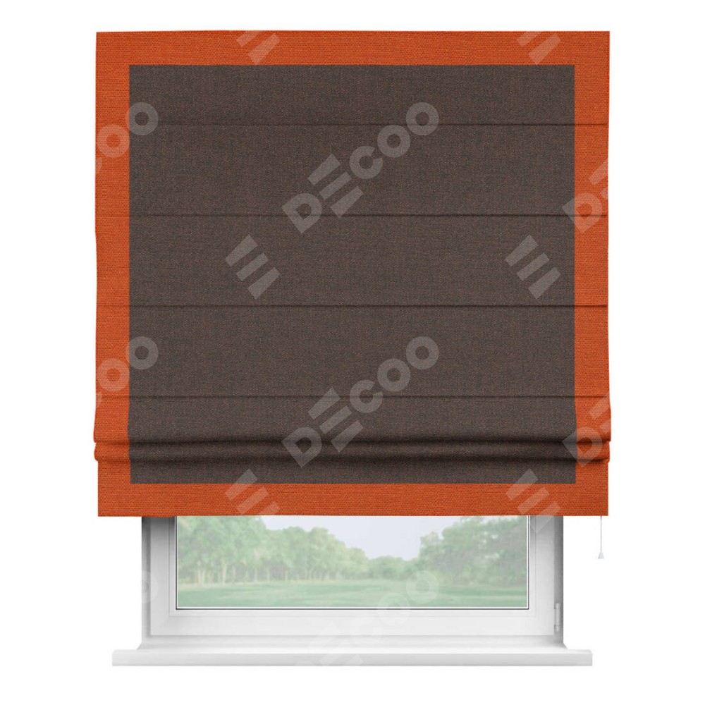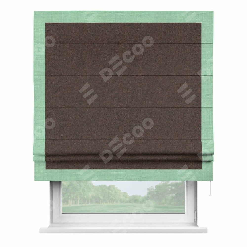 Римская штора производителя «Cortin», используется для проёма, пошита из ткани лён коричневый, артикул 53443. Отделка шторы кантом «Чесс», ткань для канта используется из льна разной расцветки на выбор. Имеет универсальный механизм и подходит для монтажа: на потолок, на стену и в нишу.