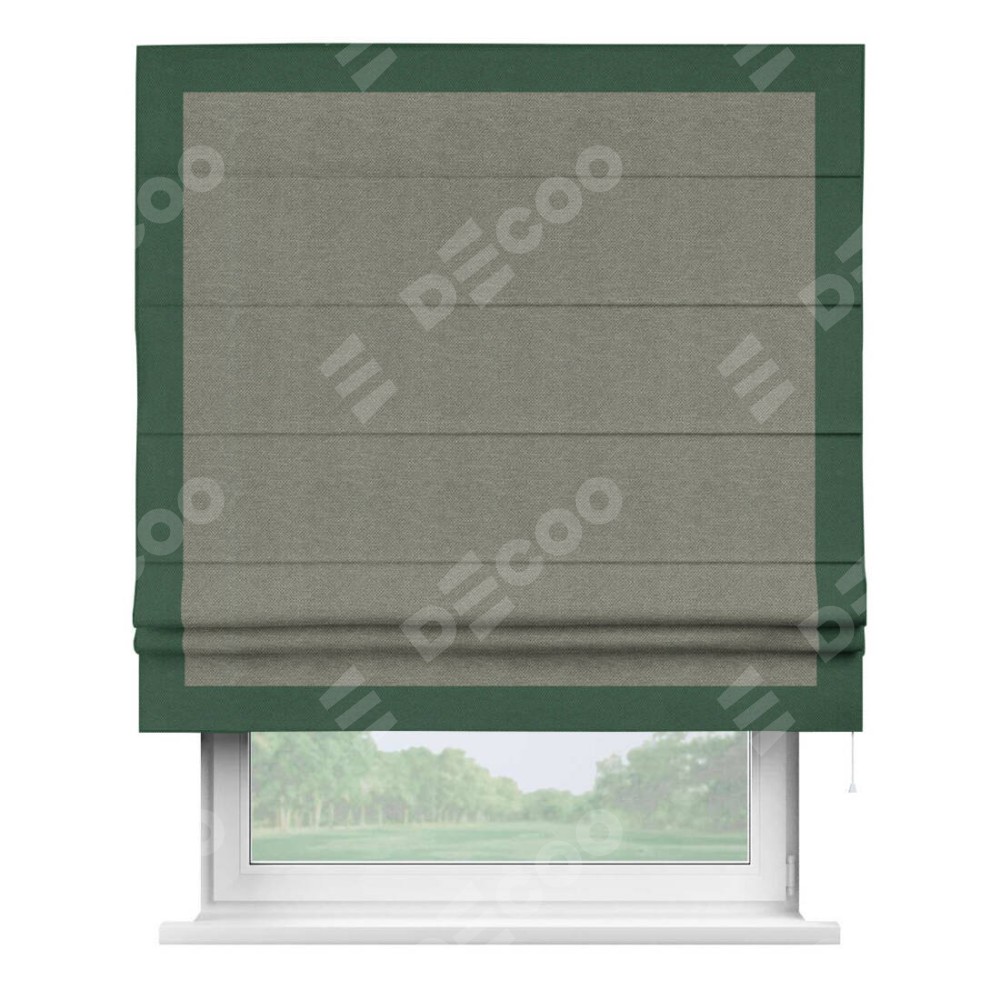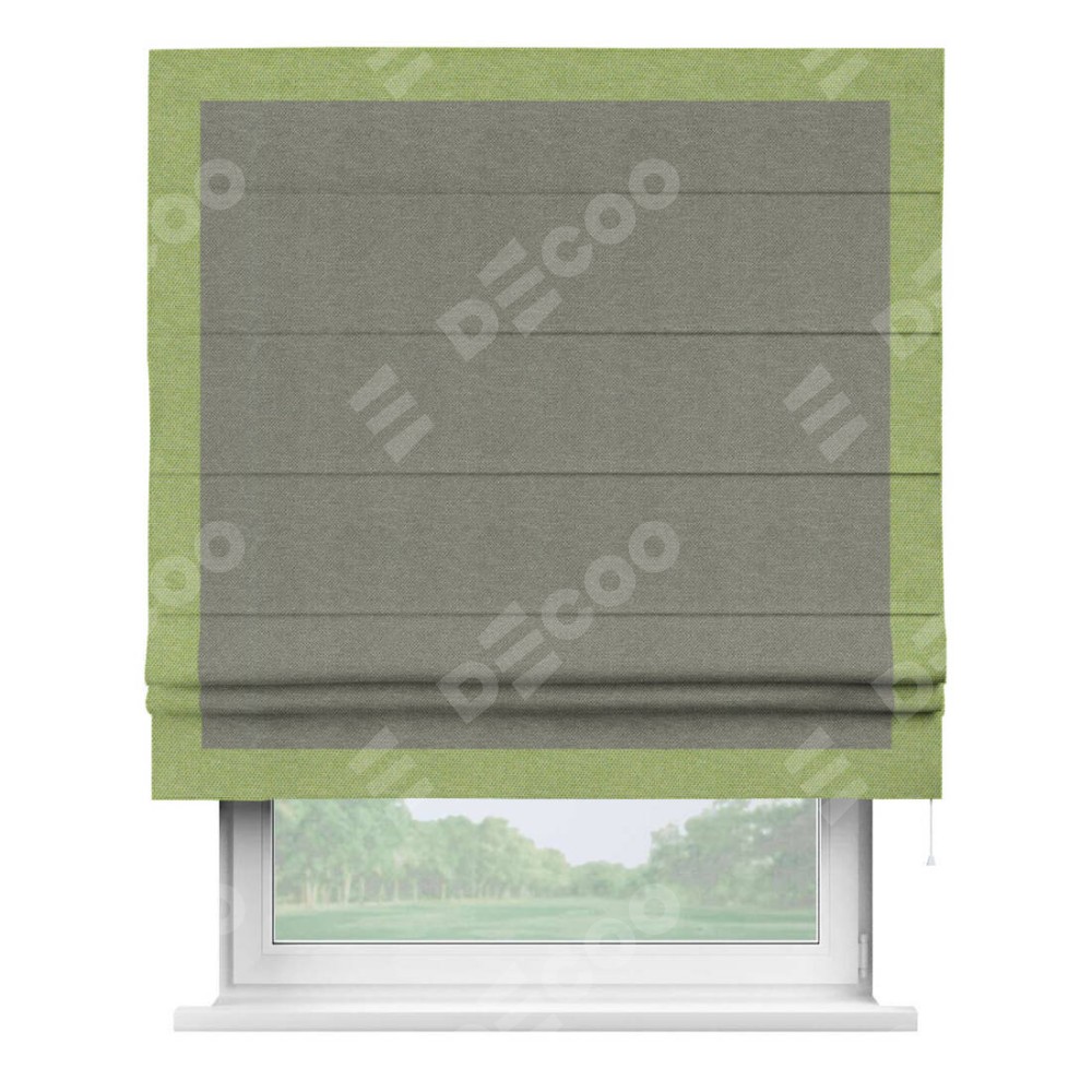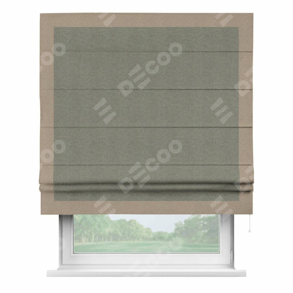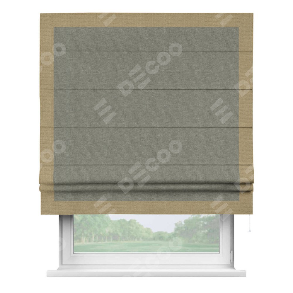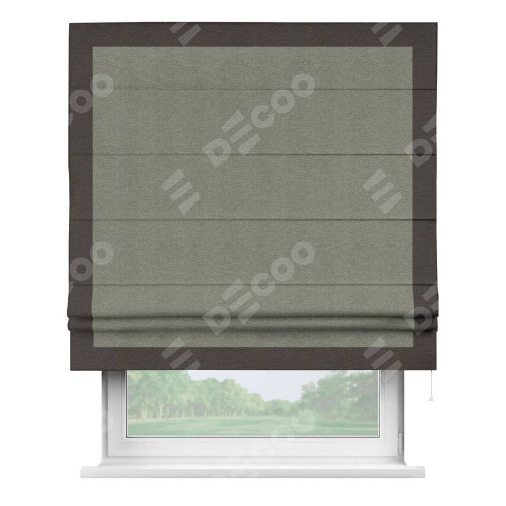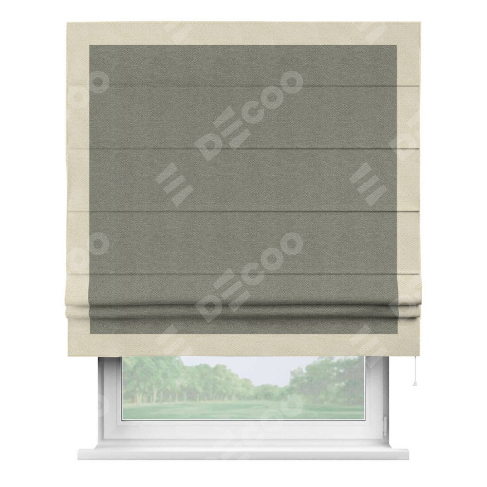 Римская штора производителя «Cortin», используется для проёма, пошита из ткани лён димаут стальной, артикул 25. Отделка шторы кантом «Чесс», ткань для канта используется из льна димаут разной расцветки на выбор. Имеет универсальный механизм и подходит для монтажа: на потолок, на стену и в нишу.