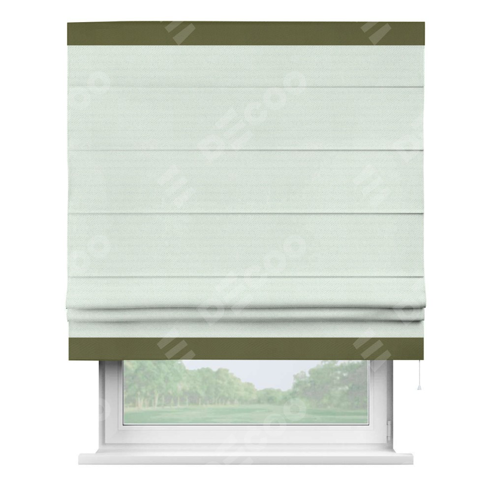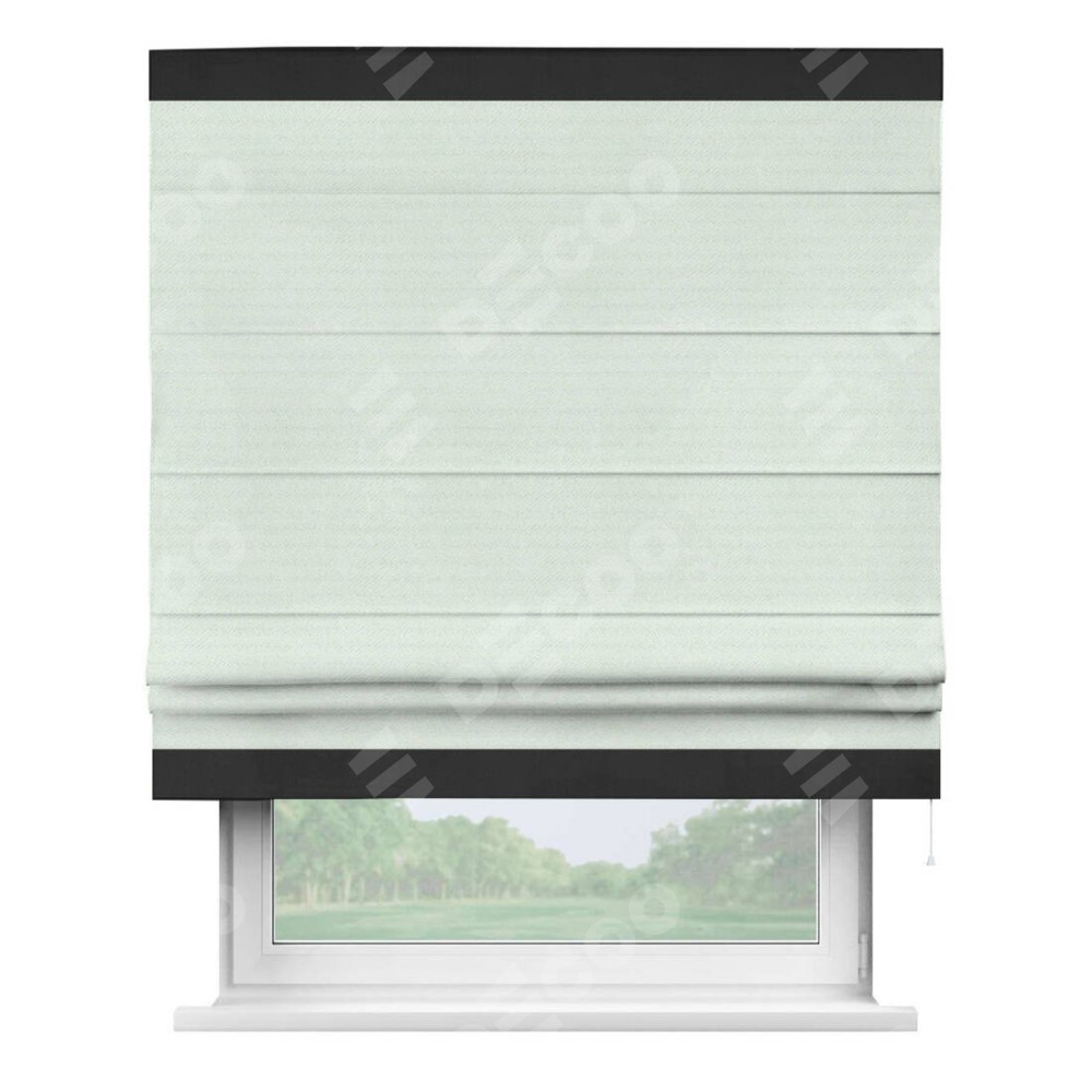 Римская штора производителя «Cortin», используется для проёма, пошита из ткани блэкаут однотонный дымчато-молочный, артикул ткани 88282. Отделка шторы кантом «Горизонт», ткань для канта используется из блэкаута однотонного разной расцветки на выбор. Имеет универсальный механизм и подходит для монтажа: на потолок, на стену и в нишу.