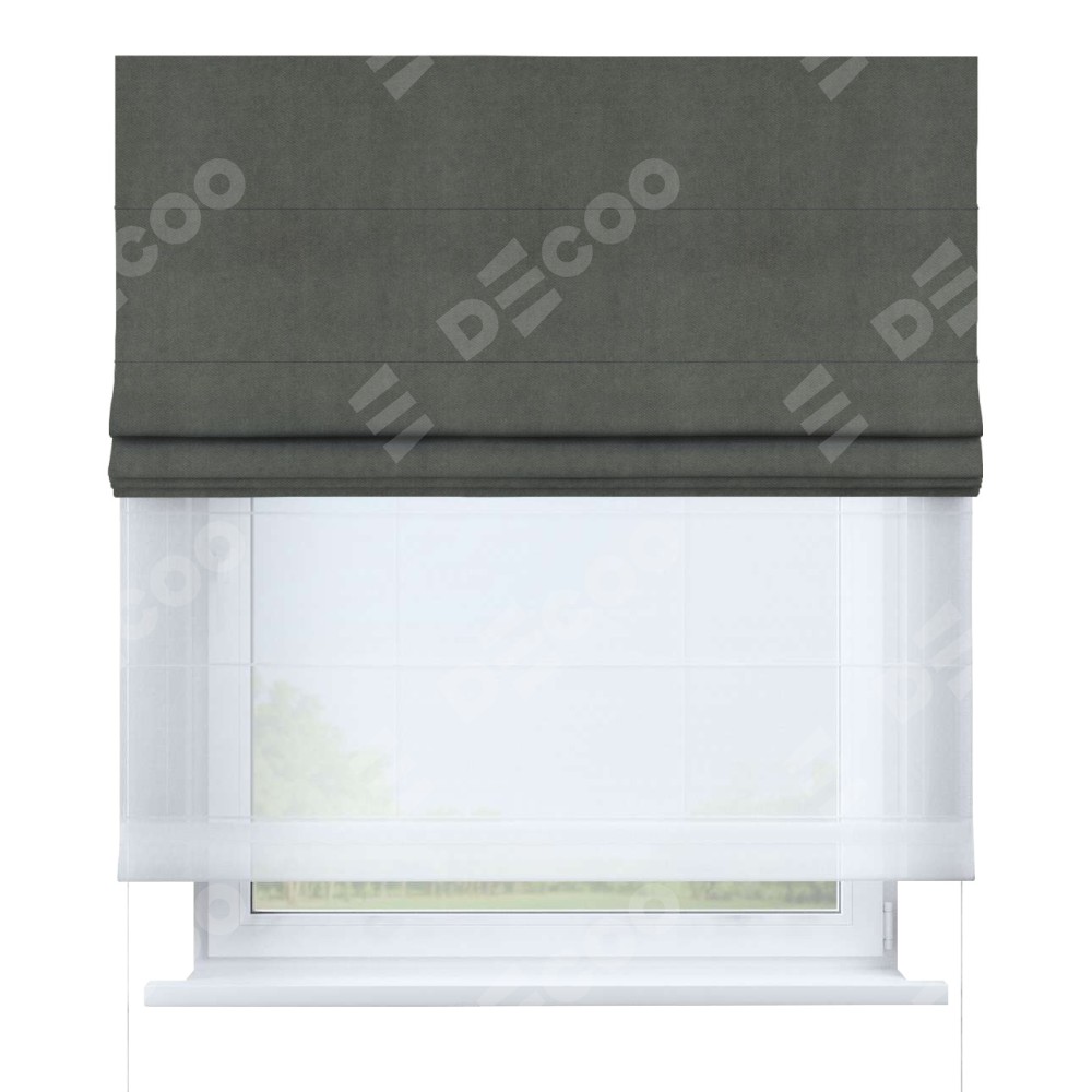 Римская штора день-ночь производителя «Cortin», используется для проёма, пошита из двух полотен, с лицевой стороны вельвет тёмно-серый артикул 85542, вторая ткань тюль (по стандарту комплектуется тюль белого цвета артикул V-01). Имеет универсальный механизм и подходит для монтажа: на потолок, на стену и в нишу.