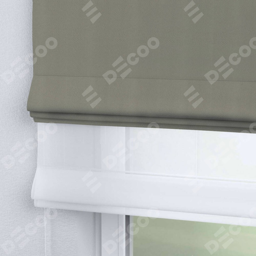 Римская штора день-ночь производителя «Cortin», используется для проёма, пошита из двух полотен, с лицевой стороны блэкаут однотонный серо-зелёный артикул 29568, вторая ткань тюль (по стандарту комплектуется тюль белого цвета артикул V-01). Имеет универсальный механизм и подходит для монтажа: на потолок, на стену и в нишу.