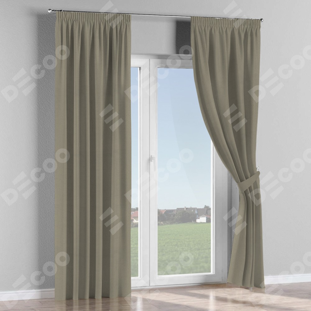 Комплект прямых штор, от производителя «Cortin», пошиты из ткани блэкаут однотонный бежево-серый, артикул ткани 00004. С изнаночной стороны в верхней части штор пристрачивается шторная лента с декоративными складками «Карандаш». Для создания элегантных складок прямые шторы шьются по стандарту с коэффициентом 1:2 (на 100 см. ширины проёма 200 см. ширины ткани).