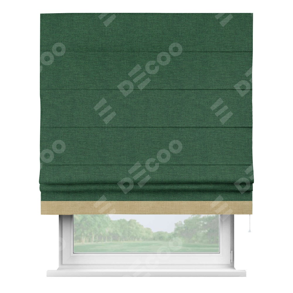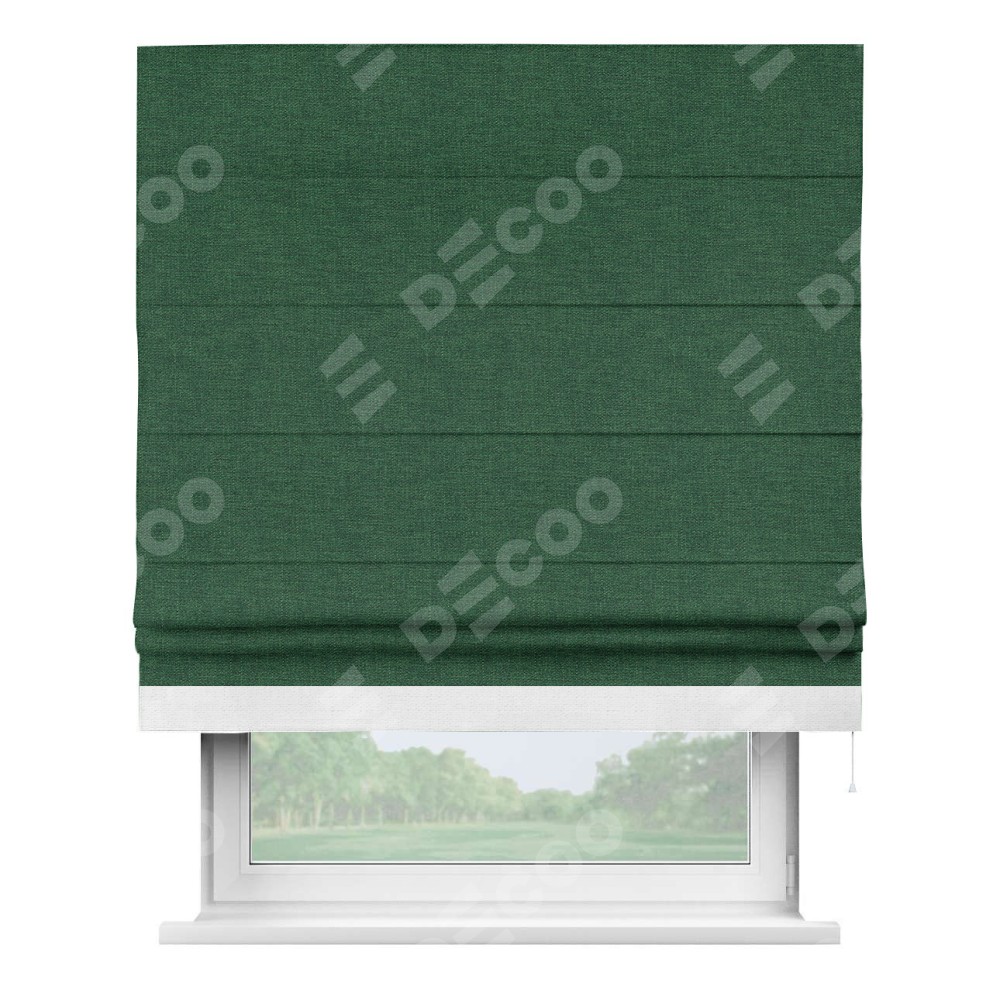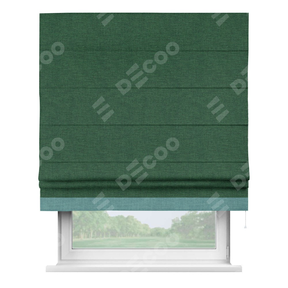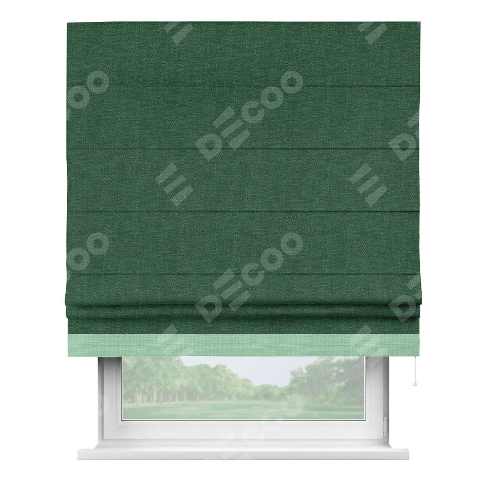 Римская штора производителя «Cortin», используется для проёма, пошита из ткани лён серо-зеленый, артикул 63740. Отделка шторы кантом «Джестер», ткань для канта используется из льна разной расцветки на выбор. Имеет универсальный механизм и подходит для монтажа: на потолок, на стену и в нишу.