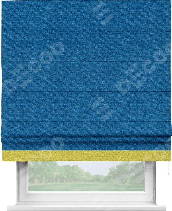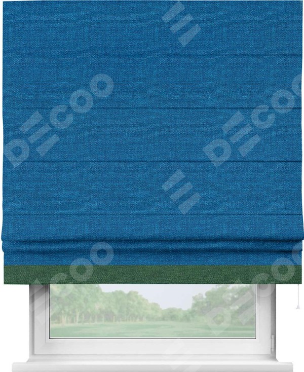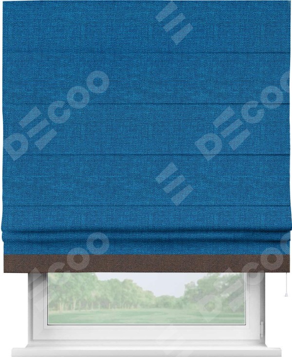 Римская штора производителя «Cortin», используется для проёма, пошита из ткани лён синий, артикул 63742. Отделка шторы кантом «Джестер», ткань для канта используется из льна разной расцветки на выбор. Имеет универсальный механизм и подходит для монтажа: на потолок, на стену и в нишу.