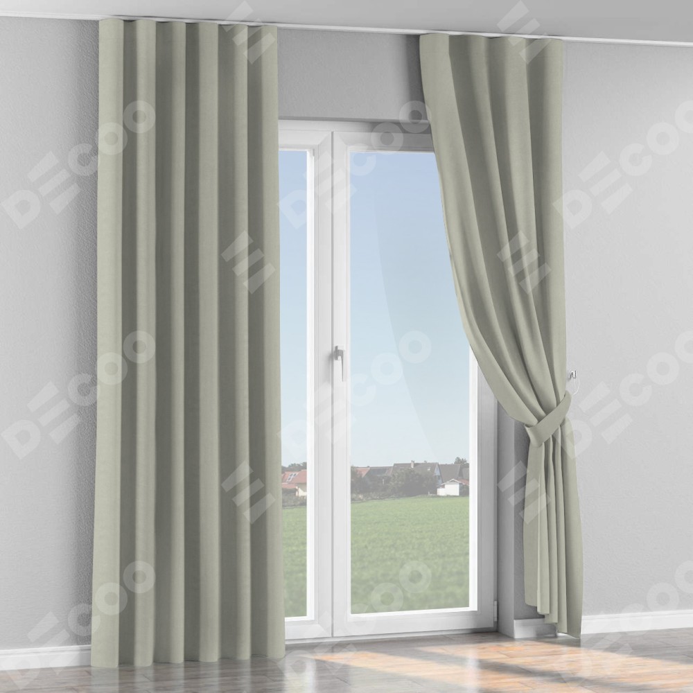 Комплект прямых штор, от производителя «Cortin», пошиты из ткани лён димаут светло-серый, артикул ткани 83025. С изнаночной стороны в верхней части штор пристрачивается шторная лента с декоративными складками «Волна». Для создания элегантных складок прямые шторы шьются по стандарту с коэффициентом 1:2 (на 100 см. ширины проёма 200 см. ширины ткани).