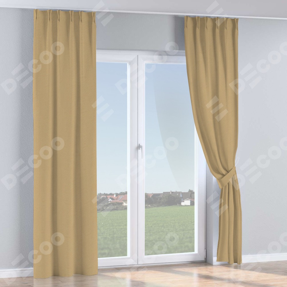 Комплект прямых штор, от производителя «Cortin», пошиты из ткани лён димаут тёмно-бежевый, артикул ткани 83037. С изнаночной стороны в верхней части штор пристрачивается шторная лента с декоративными складками «Кустик». Для создания элегантных складок прямые шторы шьются по стандарту с коэффициентом 1:2 (на 100 см. ширины проёма 200 см. ширины ткани).