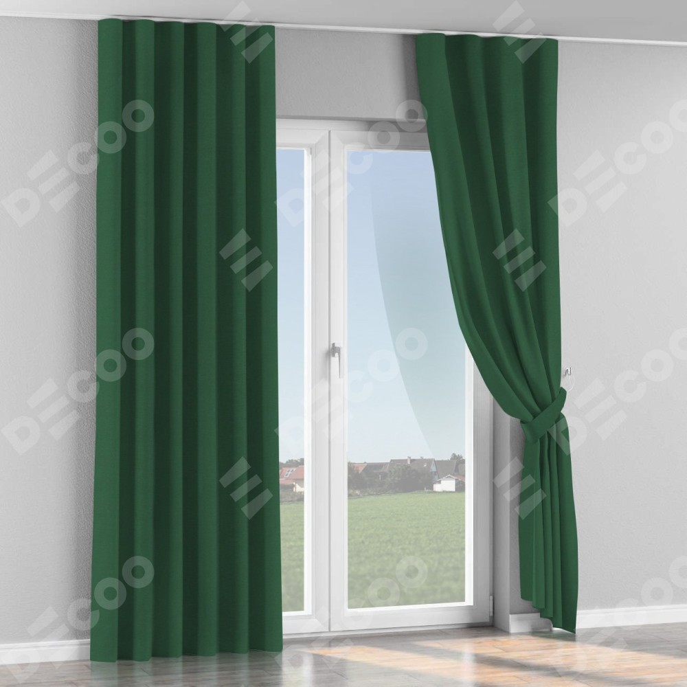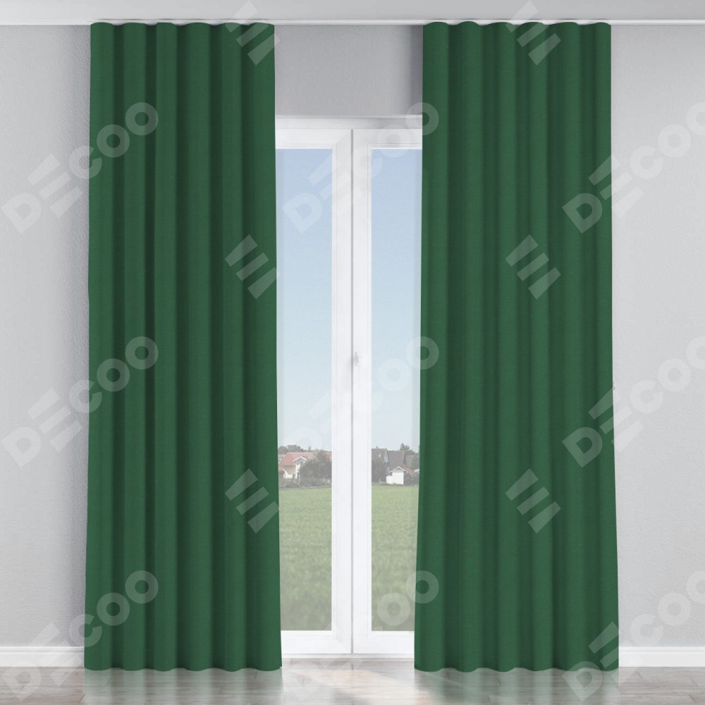 Комплект прямых штор, от производителя «Cortin», пошиты из ткани лён димаут тёмно-зелёный, артикул ткани 16246. С изнаночной стороны в верхней части штор пристрачивается шторная лента с декоративными складками «Волна». Для создания элегантных складок прямые шторы шьются по стандарту с коэффициентом 1:2 (на 100 см. ширины проёма 200 см. ширины ткани).