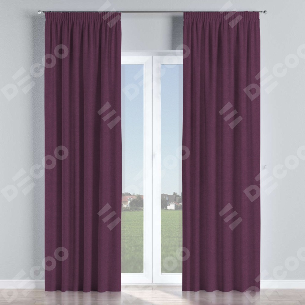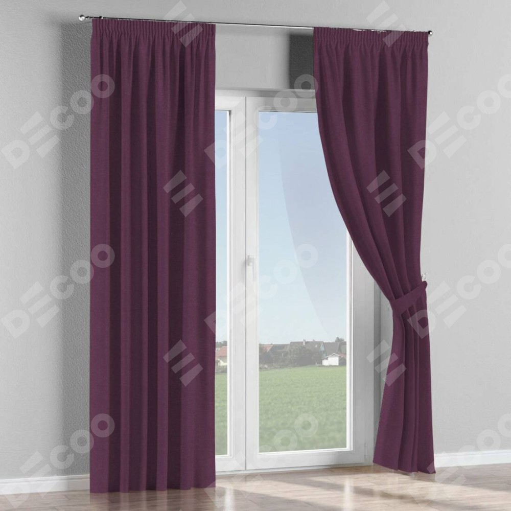 Комплект прямых штор, от производителя «Cortin», пошиты из ткани лён димаут фиолетовый, артикул ткани 8817. С изнаночной стороны в верхней части штор пристрачивается шторная лента с декоративными складками «Карандаш». Для создания элегантных складок прямые шторы шьются по стандарту с коэффициентом 1:2 (на 100 см. ширины проёма 200 см. ширины ткани).