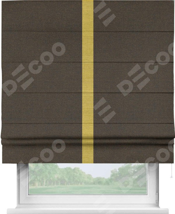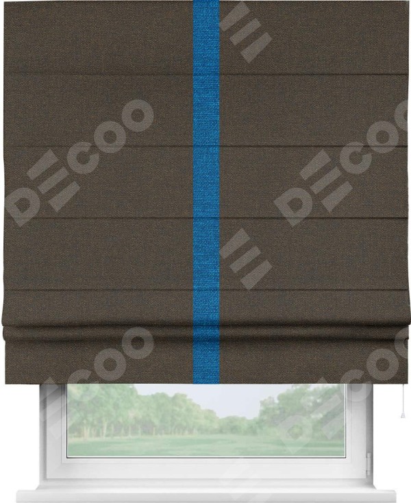 Римская штора производителя «Cortin», используется для проёма, пошита из ткани лён темно-коричневый, артикул 53444. Отделка шторы кантом «Хайвэй», ткань для канта используется из льна разной расцветки на выбор. Имеет универсальный механизм и подходит для монтажа: на потолок, на стену и в нишу.