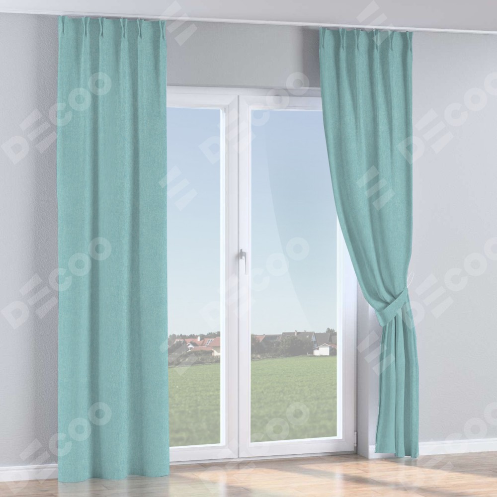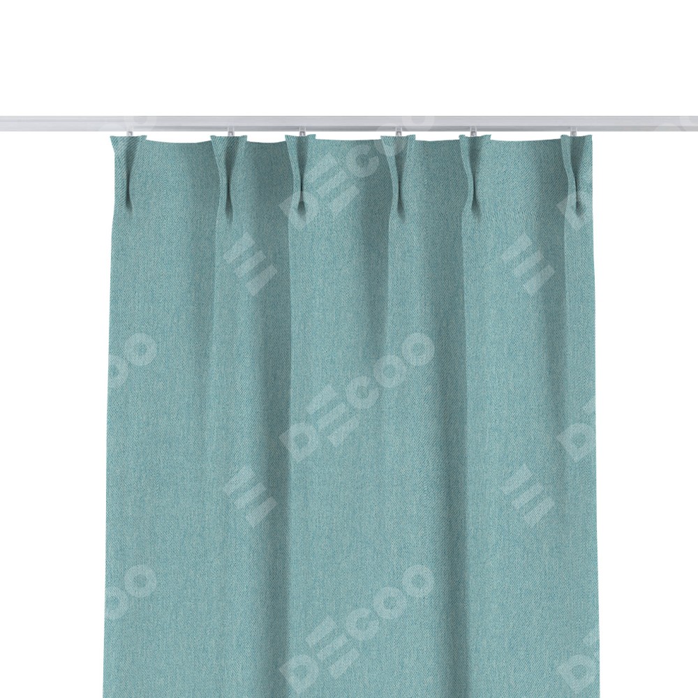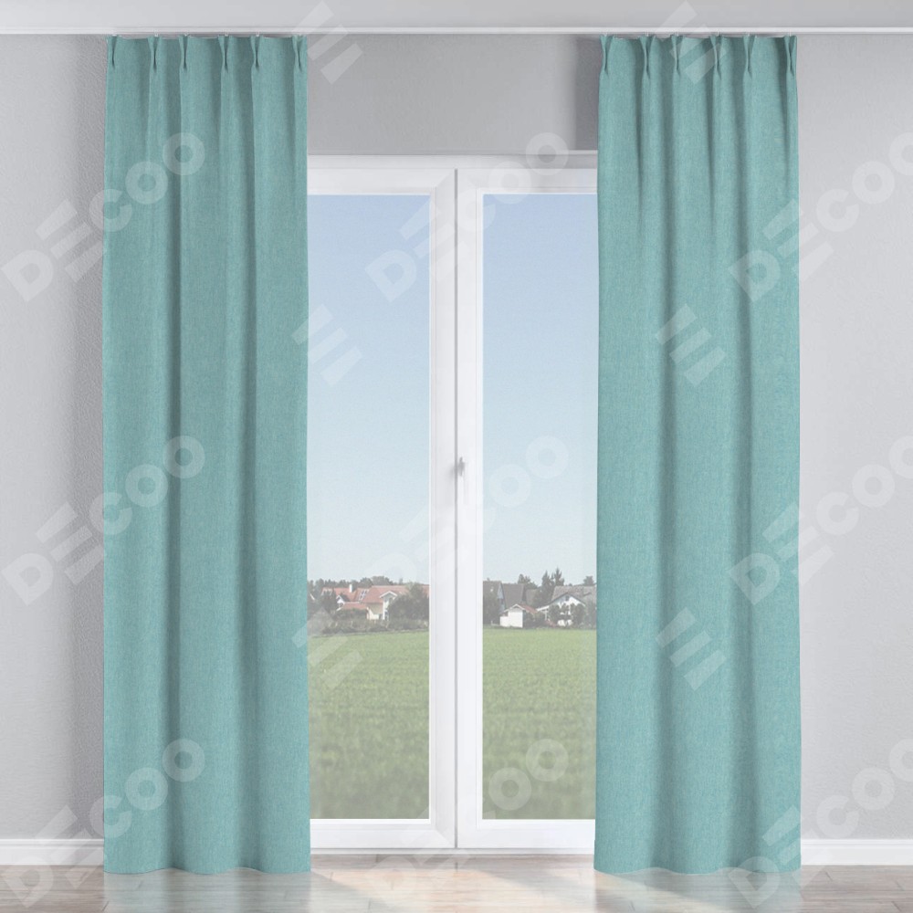 Комплект прямых штор, от производителя «Cortin», пошиты из ткани твид блэкаут небесно-голубой, артикул ткани 21578. С изнаночной стороны в верхней части штор пристрачивается шторная лента с декоративными складками «Кустик». Для создания элегантных складок прямые шторы шьются по стандарту с коэффициентом 1:2 (на 100 см. ширины проёма 200 см. ширины ткани).