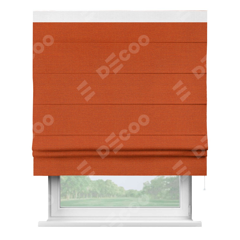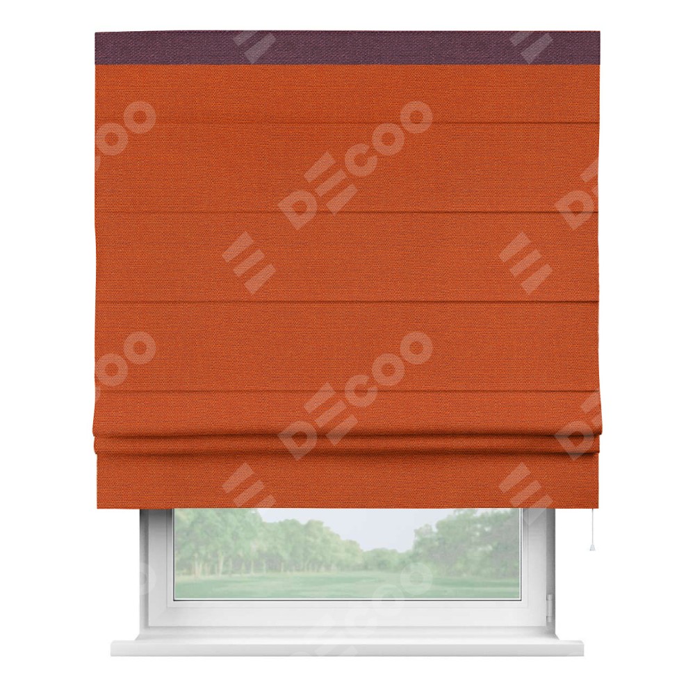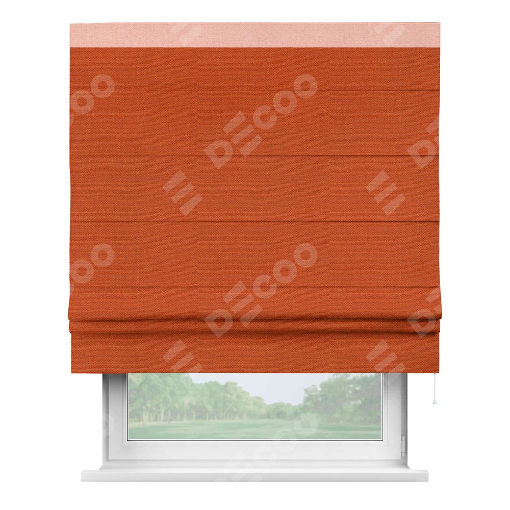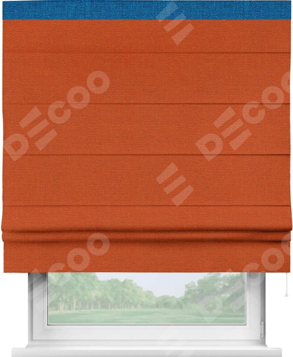 Римская штора производителя «Cortin», используется для проёма, пошита из ткани лён терракотовый, артикул 53440. Отделка шторы кантом «Кинг», ткань для канта используется из льна разной расцветки на выбор. Имеет универсальный механизм и подходит для монтажа: на потолок, на стену и в нишу.