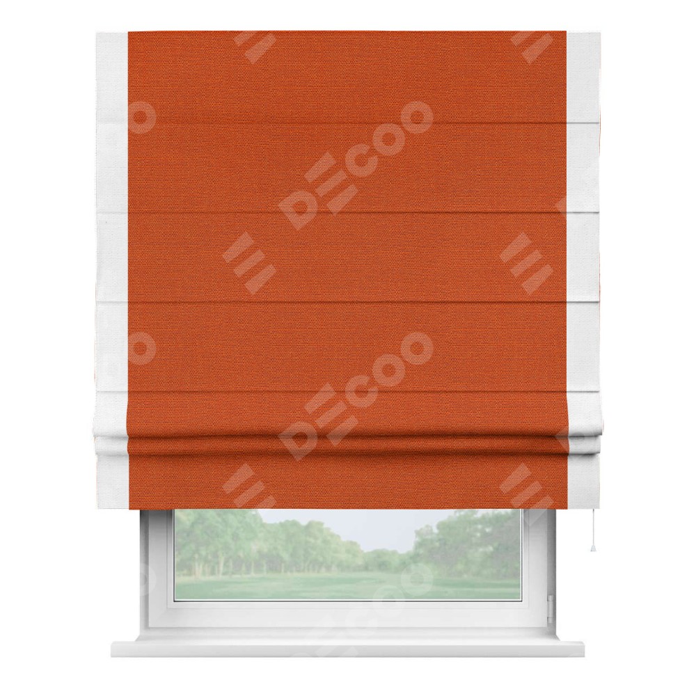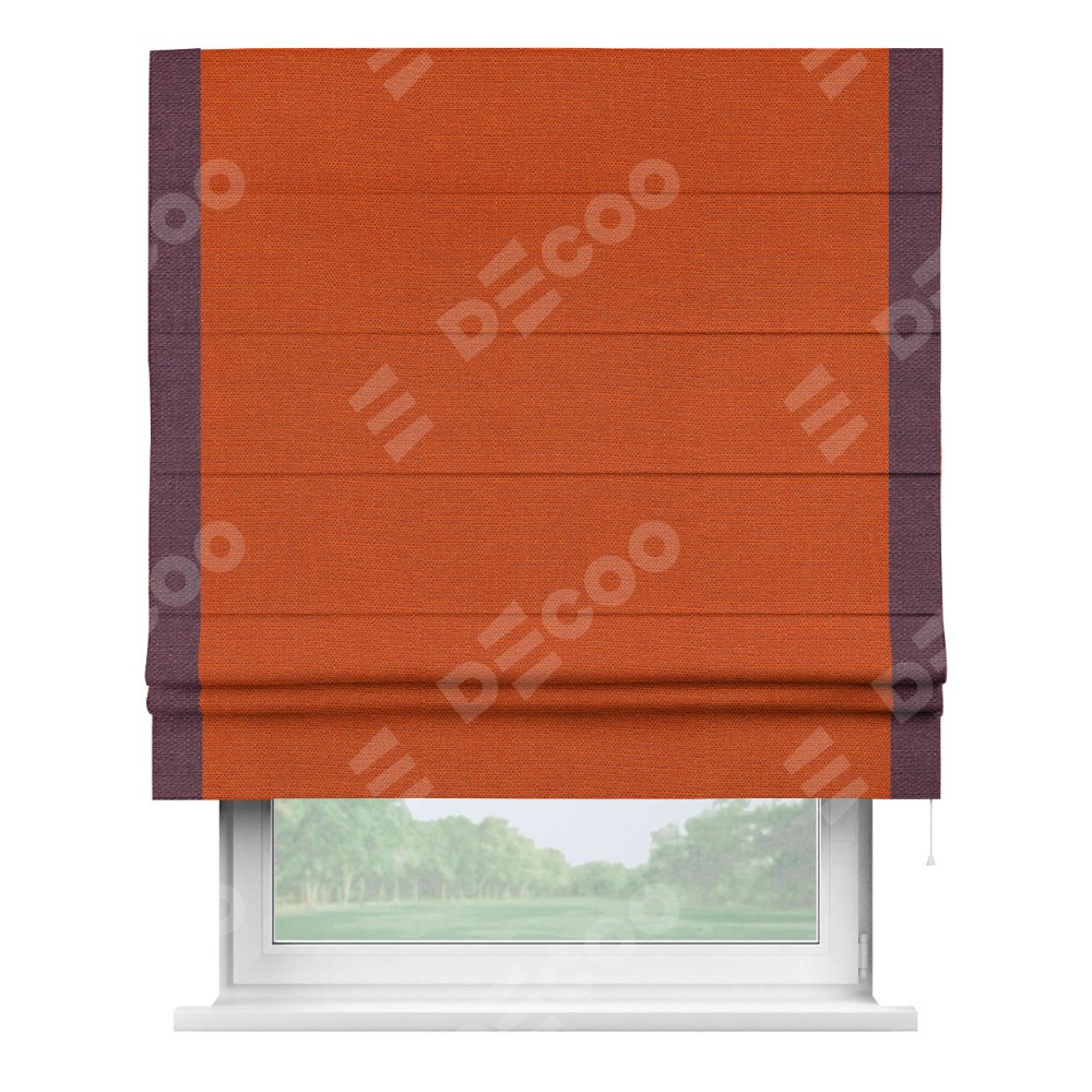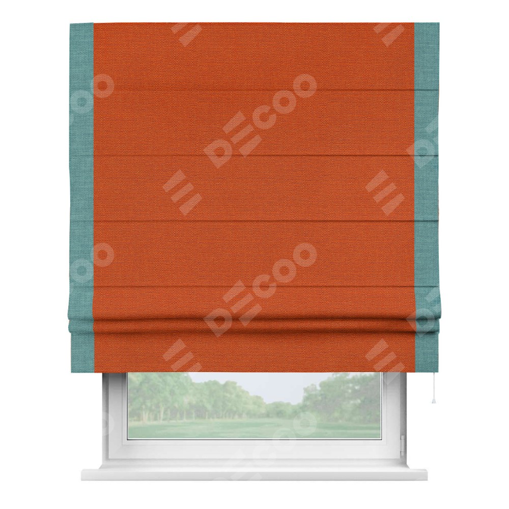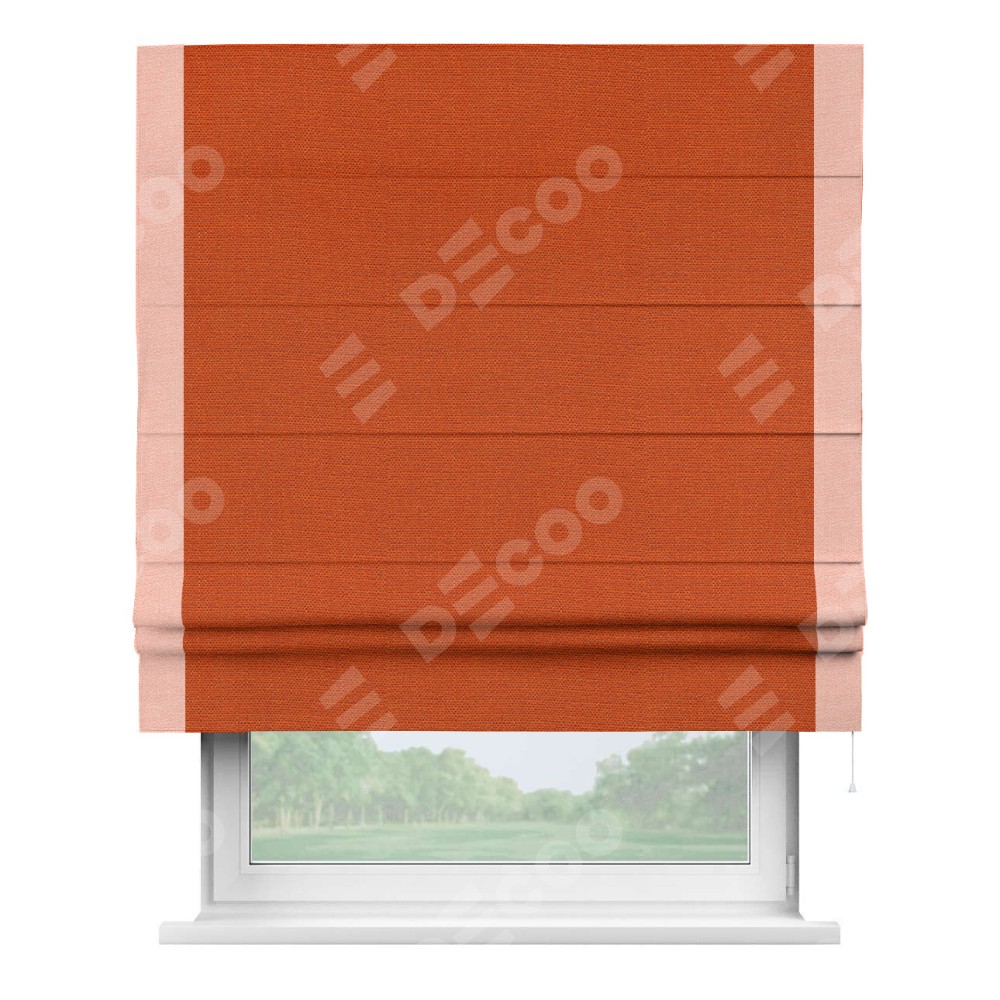 Римская штора производителя «Cortin», используется для проёма, пошита из ткани лён терракотовый, артикул 53440. Отделка шторы кантом «Стрим Дуо», ткань для канта используется из льна разной расцветки на выбор. Имеет универсальный механизм и подходит для монтажа: на потолок, на стену и в нишу.