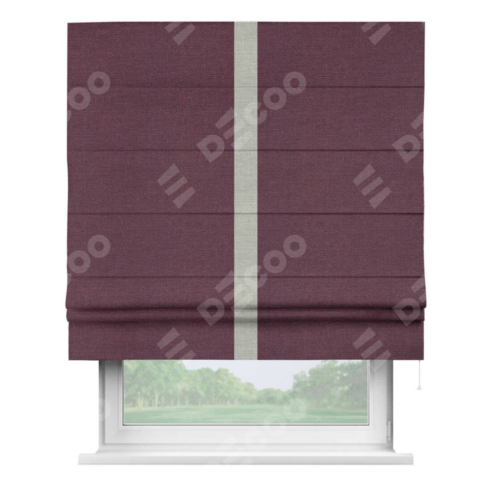 Римская штора производителя «Cortin», используется для проёма, пошита из ткани лён фиолетовый, артикул 85907. Отделка шторы кантом «Хайвэй», ткань для канта используется из льна разной расцветки на выбор. Имеет универсальный механизм и подходит для монтажа: на потолок, на стену и в нишу.