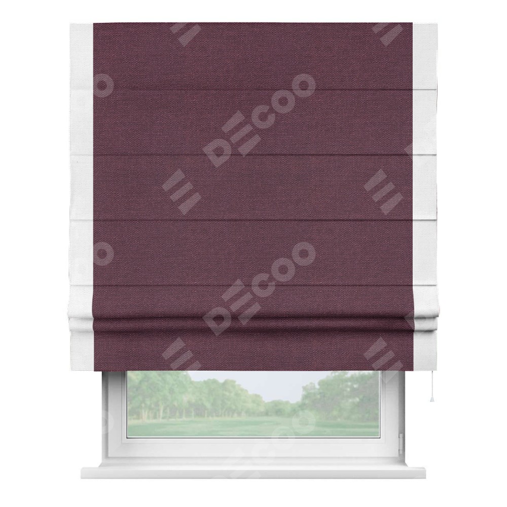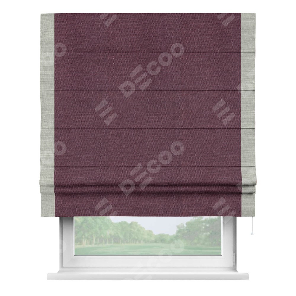 Римская штора производителя «Cortin», используется для проёма, пошита из ткани лён фиолетовый, артикул 85907. Отделка шторы кантом «Стрим Дуо», ткань для канта используется из льна разной расцветки на выбор. Имеет универсальный механизм и подходит для монтажа: на потолок, на стену и в нишу.