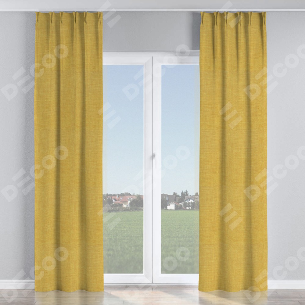 Комплект прямых штор, от производителя «Cortin», пошиты из ткани лён горчичный, артикул ткани 74740. С изнаночной стороны в верхней части штор пристрачивается шторная лента с декоративными складками «Кустик». Для создания элегантных складок прямые шторы шьются по стандарту с коэффициентом 1:2 (на 100 см. ширины проёма 200 см. ширины ткани).