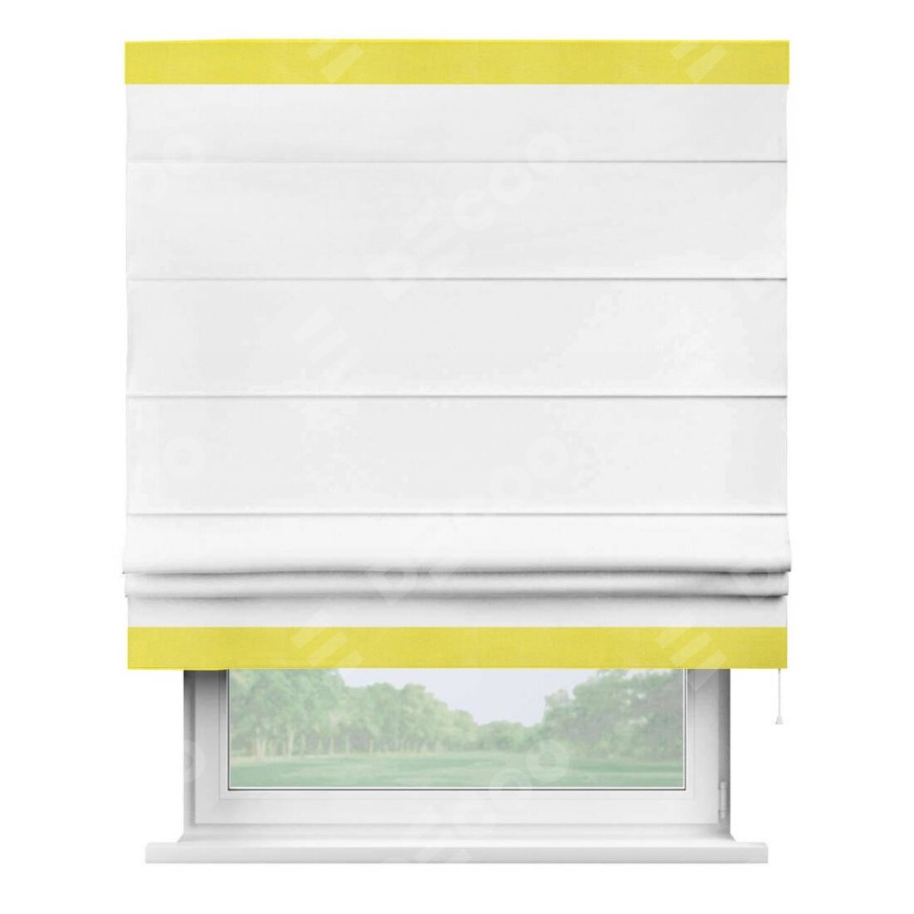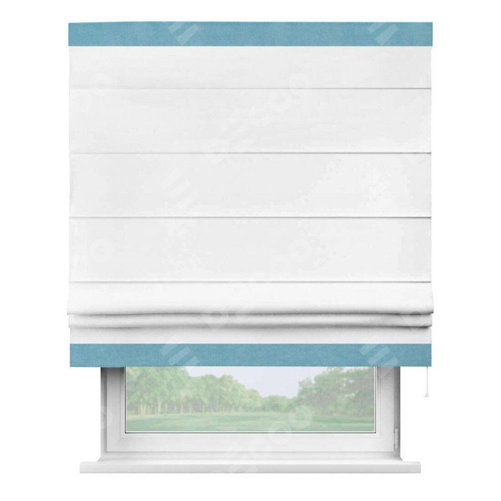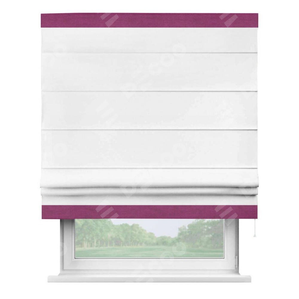 Римская штора производителя «Cortin», используется для проёма, пошита из ткани вельвет белый, артикул ткани 10810. Отделка шторы кантом «Горизонт», ткань для канта используется из вельвета разной расцветки на выбор. Имеет универсальный механизм и подходит для монтажа: на потолок, на стену и в нишу.