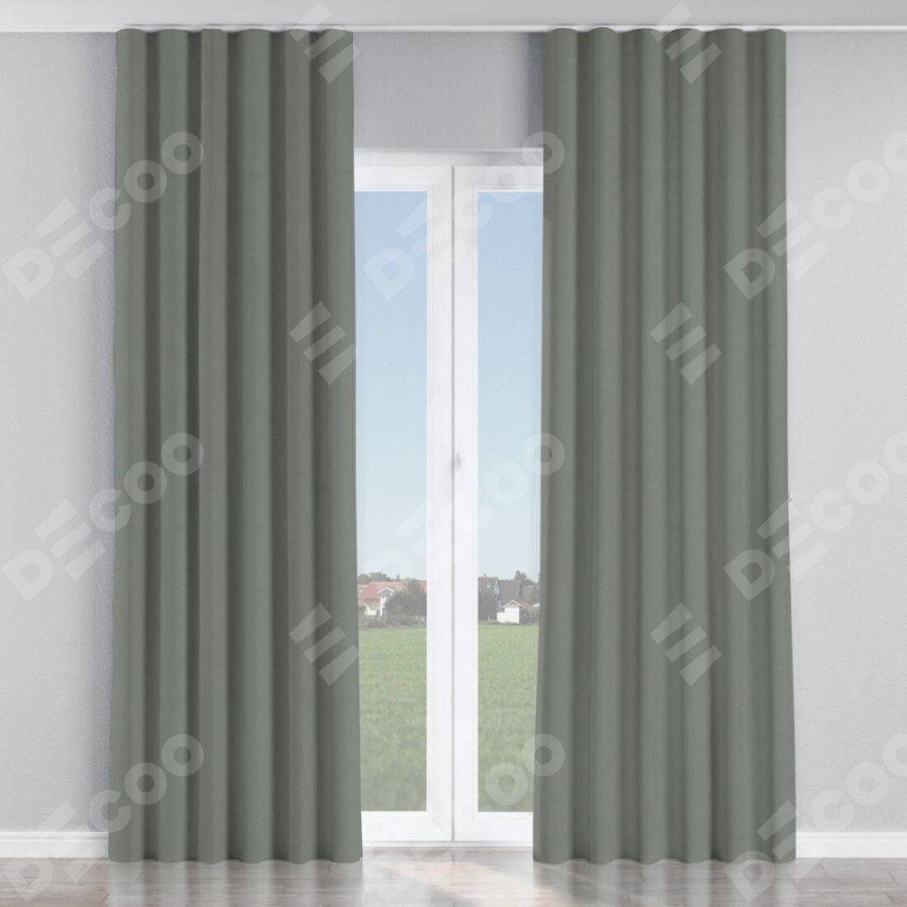 Комплект прямых штор, от производителя «Cortin», пошиты из ткани блэкаут однотонный тёмно-серый, артикул ткани 18077. С изнаночной стороны в верхней части штор пристрачивается шторная лента с декоративными складками «Волна». Для создания элегантных складок прямые шторы шьются по стандарту с коэффициентом 1:2 (на 100 см. ширины проёма 200 см. ширины ткани).