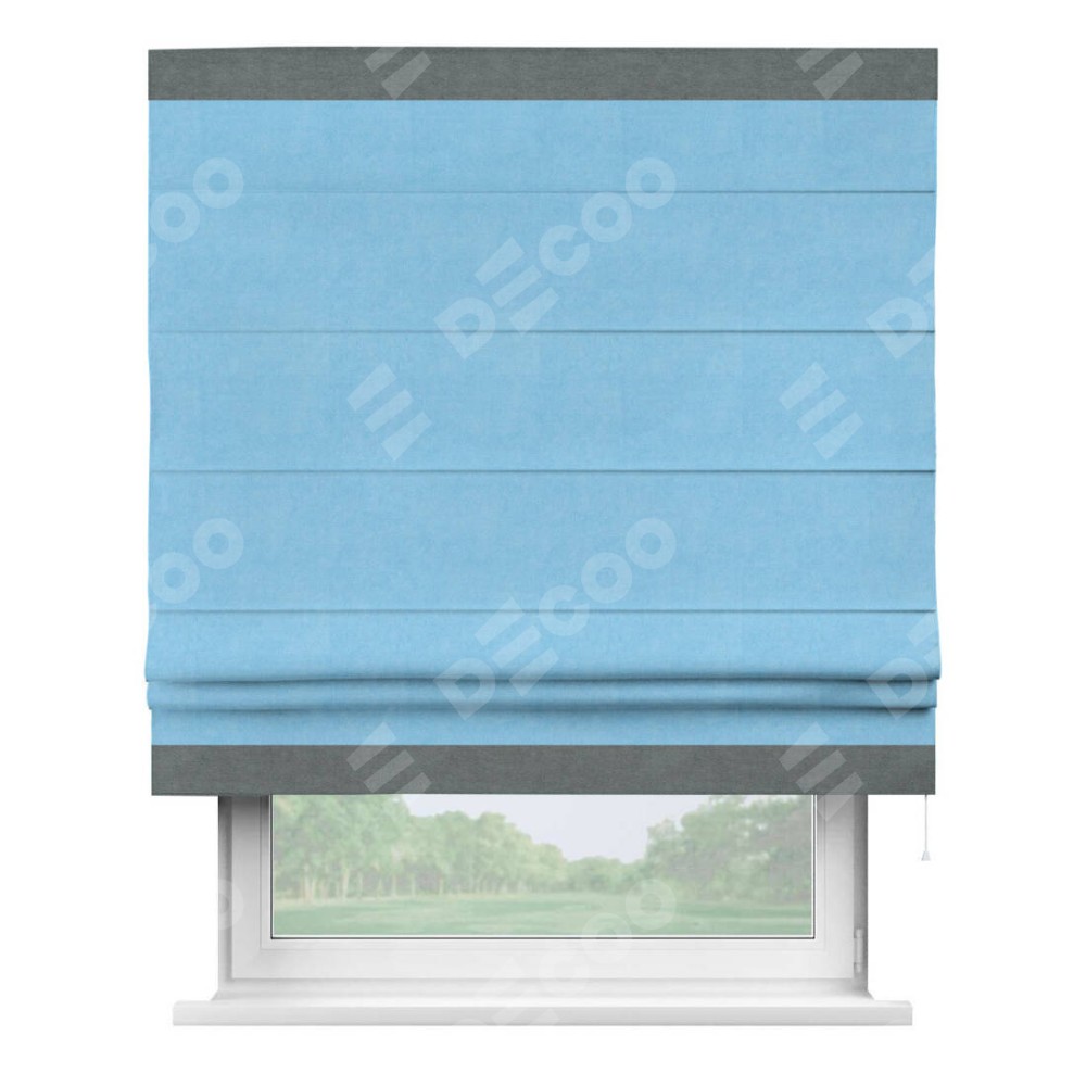 Римская штора производителя «Cortin», используется для проёма, пошита из ткани вельвет голубой, артикул ткани 85544. Отделка шторы кантом «Горизонт», ткань для канта используется из вельвета разной расцветки на выбор. Имеет универсальный механизм и подходит для монтажа: на потолок, на стену и в нишу.
