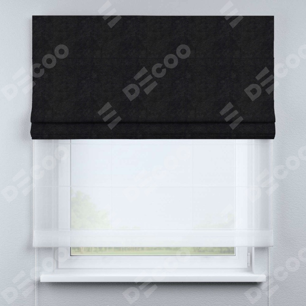 Римская штора день-ночь производителя «Cortin», используется для проёма, пошита из двух полотен, с лицевой стороны cotton блэкаут тёмно-серый артикул 35282, вторая ткань тюль (по стандарту комплектуется тюль белого цвета артикул V-01). Имеет универсальный механизм и подходит для монтажа: на потолок, на стену и в нишу.