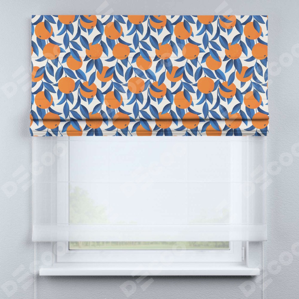 Римская штора день-ночь производителя «Cortin», используется для проёма, пошита из двух полотен, с лицевой блэкаут с нанесением сублимационной печати «Апельсиновое настроение», вторая ткань тюль (по стандарту комплектуется тюль белого цвета артикул V-01). Имеет универсальный механизм и подходит для монтажа: на потолок, на стену и в нишу.