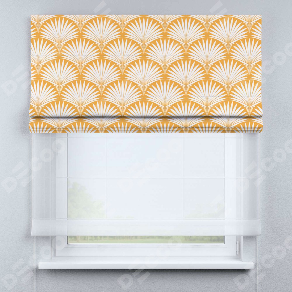 Римская штора день-ночь производителя «Cortin», используется для проёма, пошита из двух полотен, с лицевой блэкаут с нанесением сублимационной печати «Арт-деко листья желтый», вторая ткань тюль (по стандарту комплектуется тюль белого цвета артикул V-01). Имеет универсальный механизм и подходит для монтажа: на потолок, на стену и в нишу.
