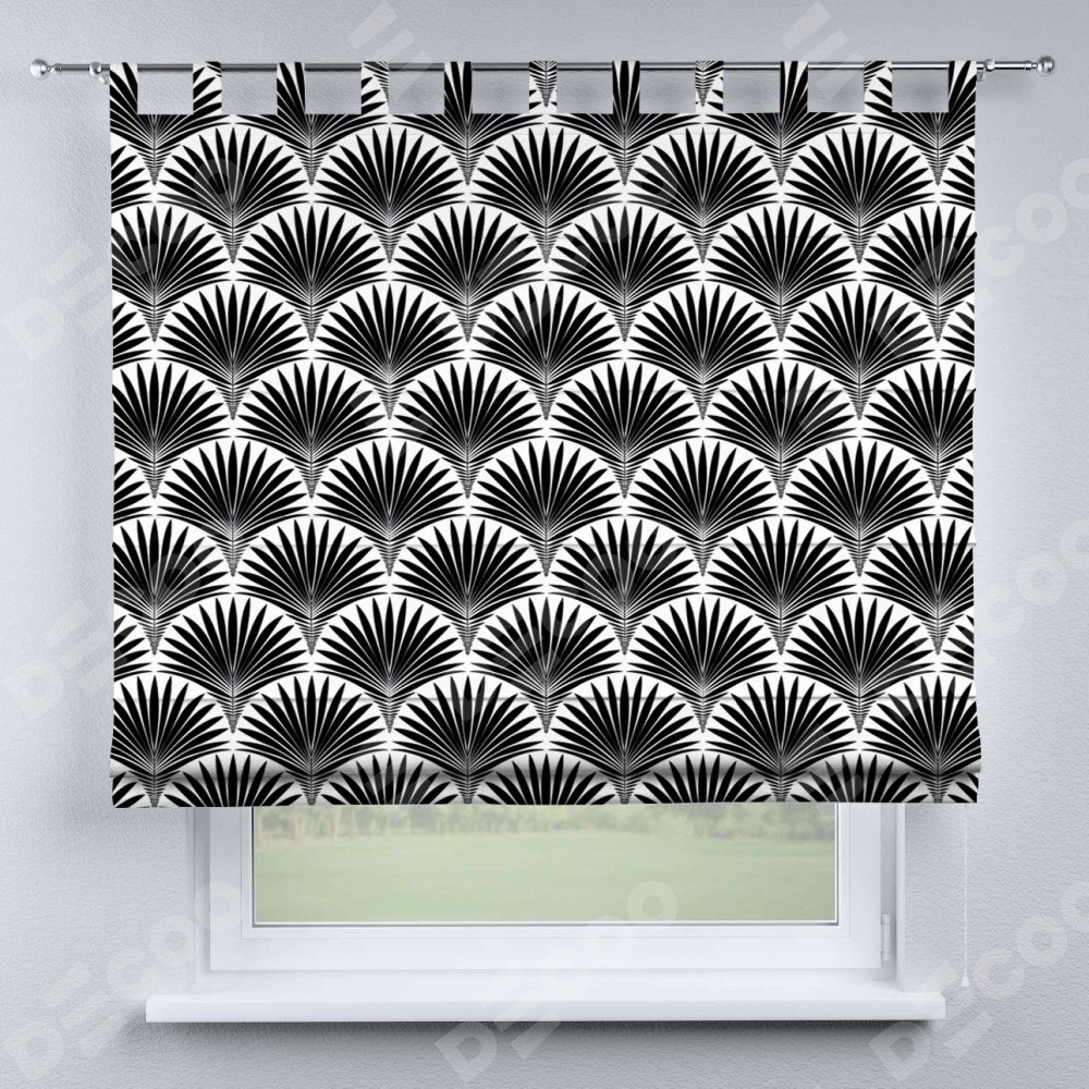 Римская штора производителя «Cortin», используется для проёма, пошита из ткани блэкаут с нанесением сублимационной печати «Арт-деко листья черный». Данная модель пошита на петлях, комплектуется на выбор круглым карнизом и подходит для монтажа на стену. Римская штора на петлях имеет простую систему регулировки высоты, отличительным преимуществом данной модели является простой способ монтажа. Достаточно повесить ее на трубу и штора готова!