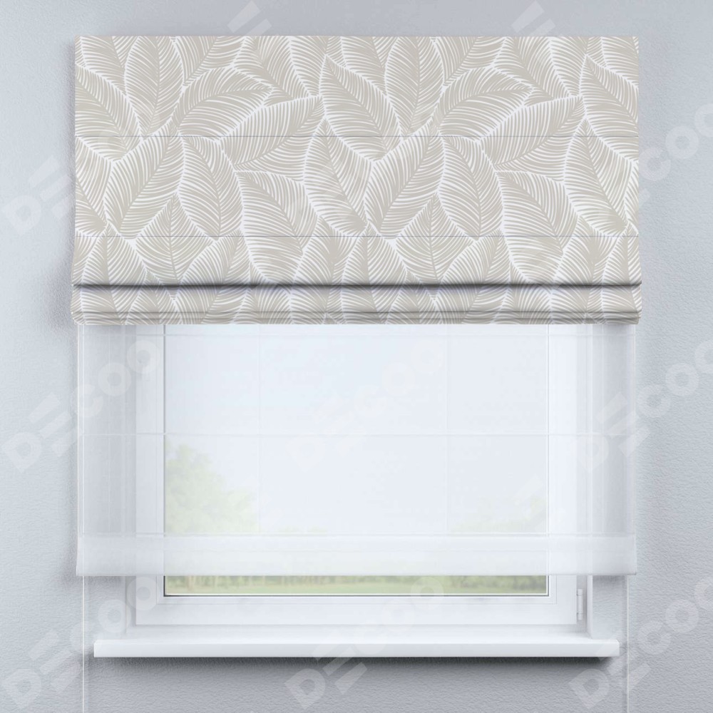 Римская штора день-ночь производителя «Cortin», используется для проёма, пошита из двух полотен, с лицевой блэкаут с нанесением сублимационной печати «Бежевые листья», вторая ткань тюль (по стандарту комплектуется тюль белого цвета артикул V-01). Имеет универсальный механизм и подходит для монтажа: на потолок, на стену и в нишу.