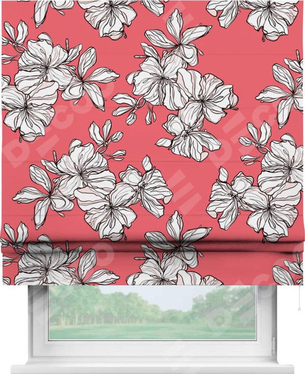 Римская штора производителя «Cortin», используется для проёма, пошита из ткани блэкаут с нанесением сублимационной печати «Белые цветы». Имеет универсальный механизм и подходит для монтажа: на потолок, на стену и в нишу.