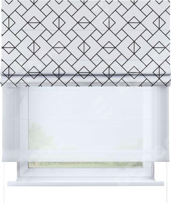 Римская штора день-ночь производителя «Cortin», используется для проёма, пошита из двух полотен, с лицевой блэкаут с нанесением сублимационной печати «Геометрический орнамент», вторая ткань тюль (по стандарту комплектуется тюль белого цвета артикул V-01). Имеет универсальный механизм и подходит для монтажа: на потолок, на стену и в нишу.