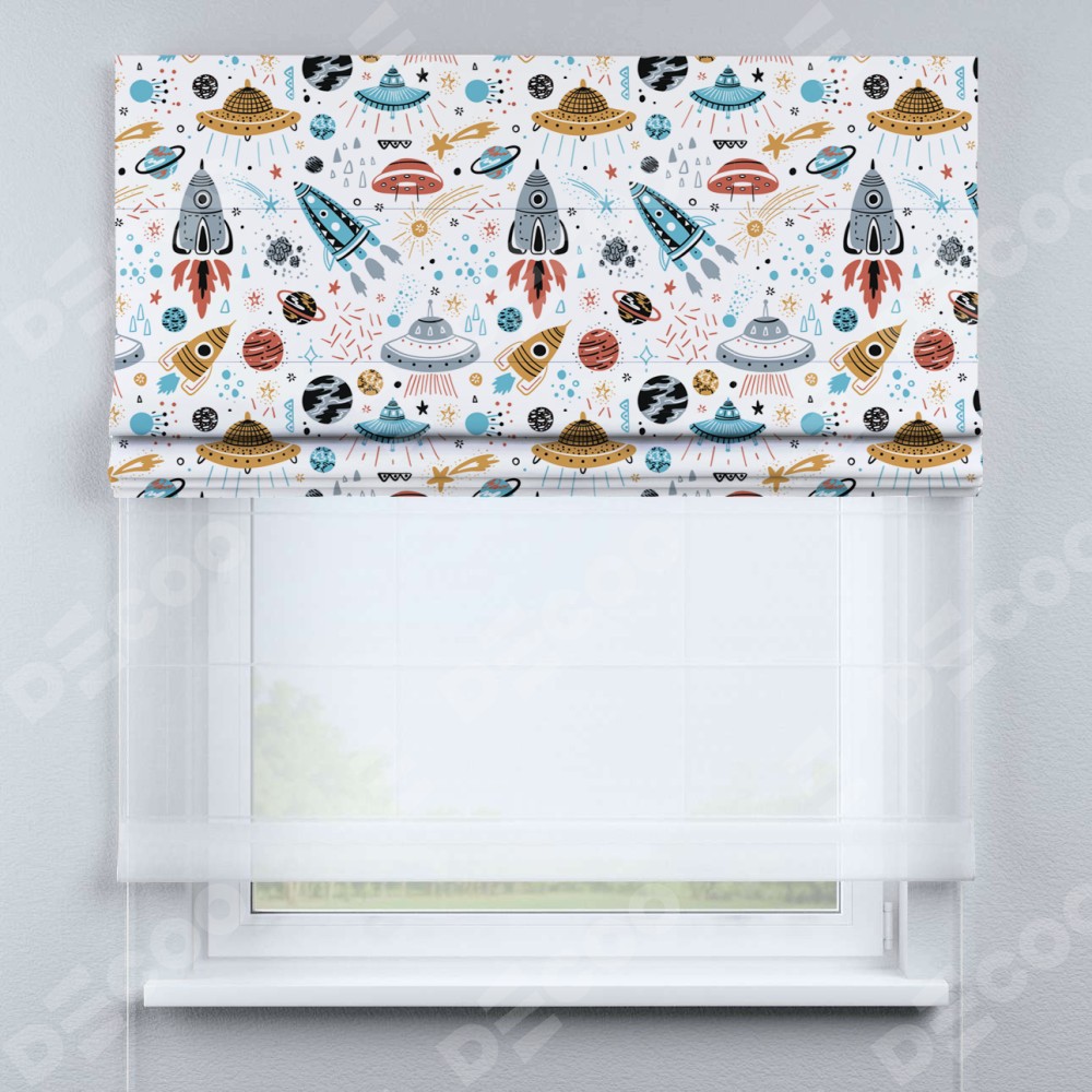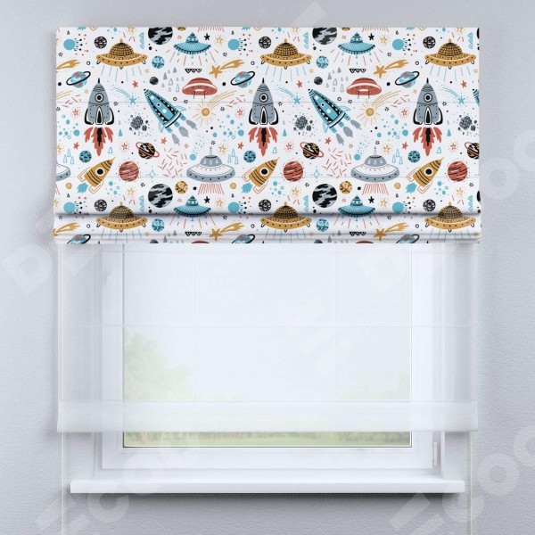 Римская штора день-ночь производителя «Cortin», используется для проёма, пошита из двух полотен, с лицевой блэкаут с нанесением сублимационной печати «Космическое приключение», вторая ткань тюль (по стандарту комплектуется тюль белого цвета артикул V-01). Имеет универсальный механизм и подходит для монтажа: на потолок, на стену и в нишу.