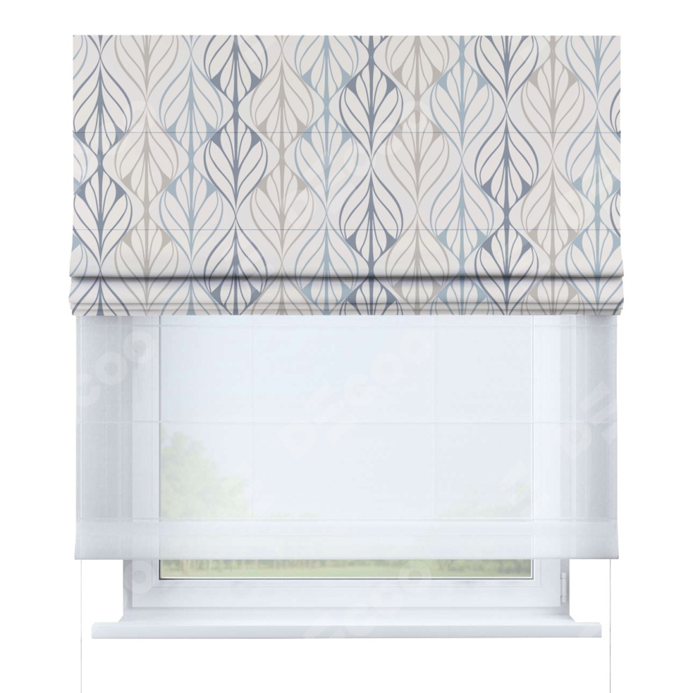 Римская штора день-ночь производителя «Cortin», используется для проёма, пошита из двух полотен, с лицевой блэкаут с нанесением сублимационной печати Растительный орнамент», вторая ткань тюль (по стандарту комплектуется тюль белого цвета артикул V-01). Имеет универсальный механизм и подходит для монтажа: на потолок, на стену и в нишу.