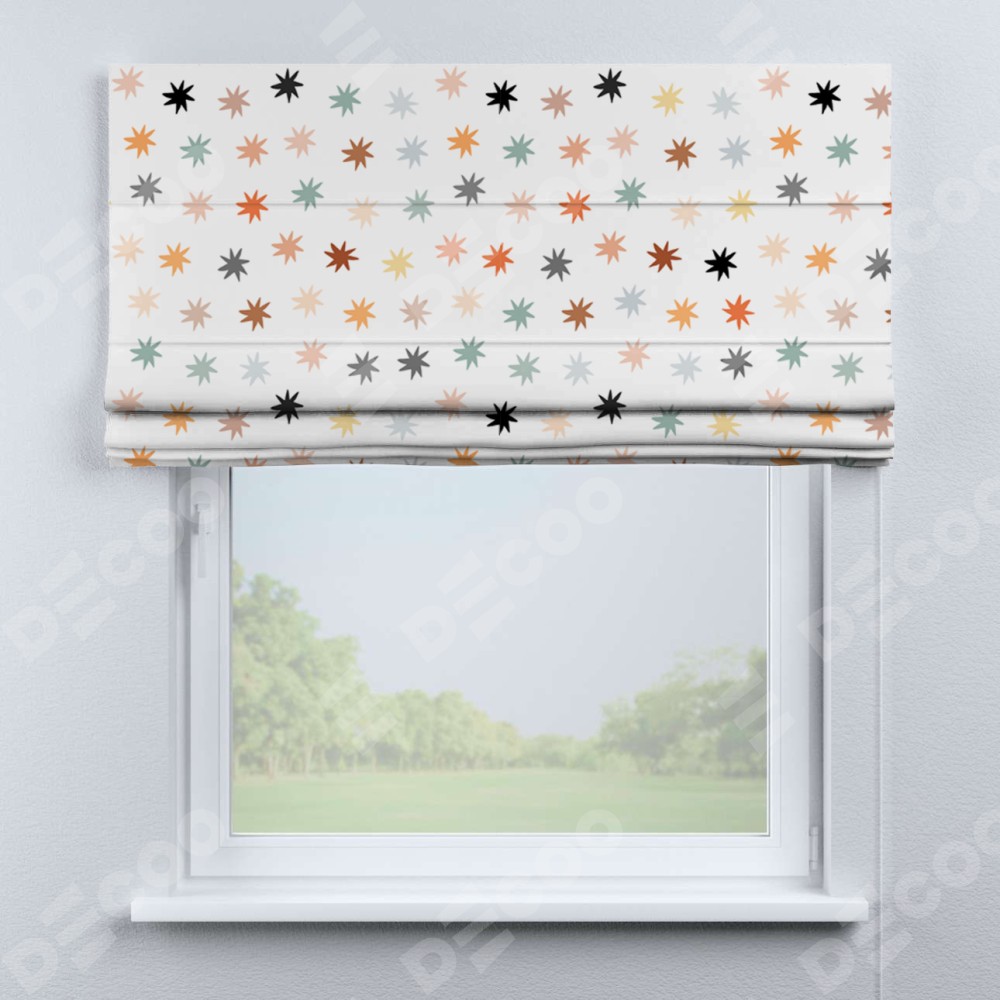 Римская штора производителя «Cortin», используется для проёма, пошита из ткани блэкаут с нанесением сублимационной печати «Разноцветные звёзды». Имеет универсальный механизм и подходит для монтажа: на потолок, на стену и в нишу.