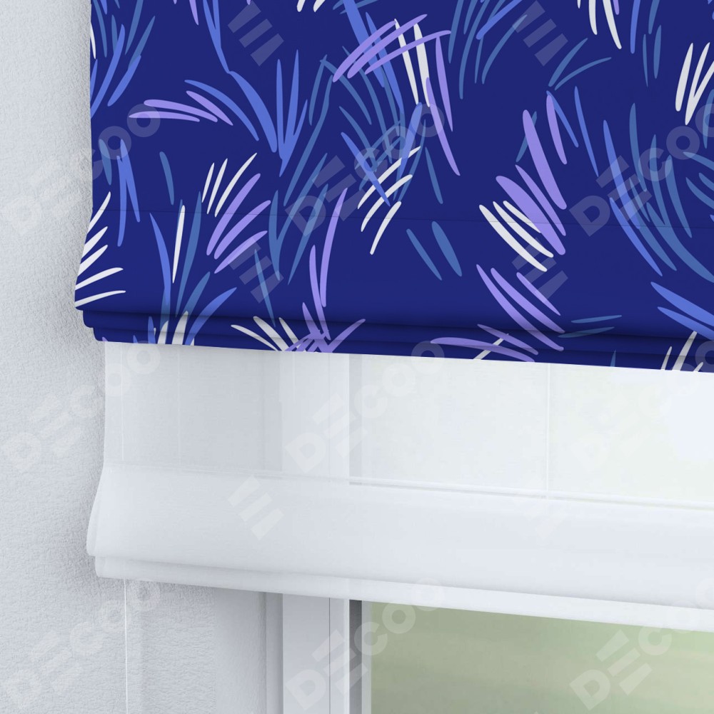 Римская штора день-ночь производителя «Cortin», используется для проёма, пошита из двух полотен, с лицевой блэкаут с нанесением сублимационной печати «Синяя абстракция», вторая ткань тюль (по стандарту комплектуется тюль белого цвета артикул V-01). Имеет универсальный механизм и подходит для монтажа: на потолок, на стену и в нишу.