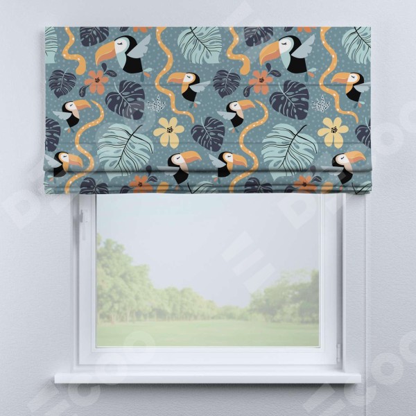 Римская штора производителя «Cortin», используется для проёма, пошита из ткани блэкаут с нанесением сублимационной печати «Экзотические птицы». Имеет универсальный механизм и подходит для монтажа: на потолок, на стену и в нишу.