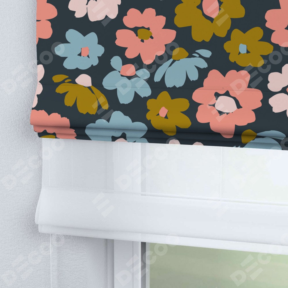 Римская штора день-ночь производителя «Cortin», используется для проёма, пошита из двух полотен, с лицевой блэкаут с нанесением сублимационной печати «Яркие цветы», вторая ткань тюль (по стандарту комплектуется тюль белого цвета артикул V-01). Имеет универсальный механизм и подходит для монтажа: на потолок, на стену и в нишу.