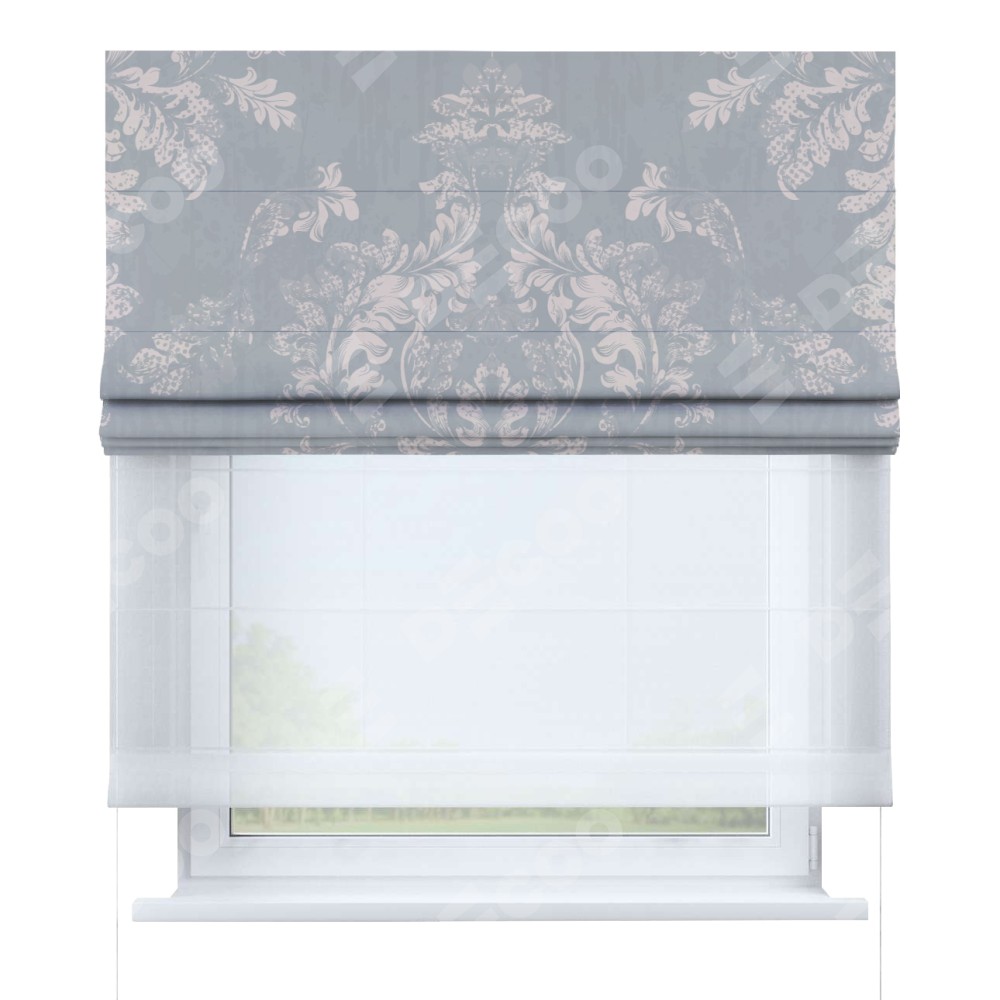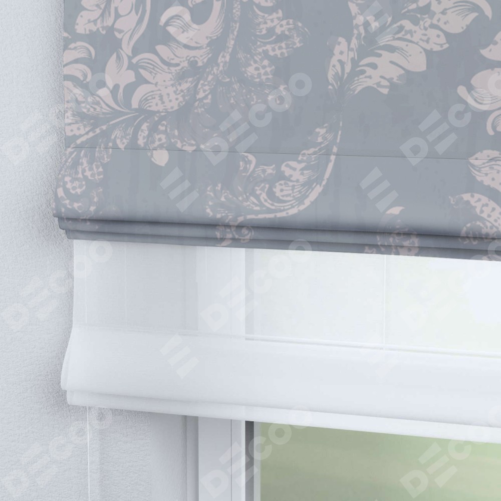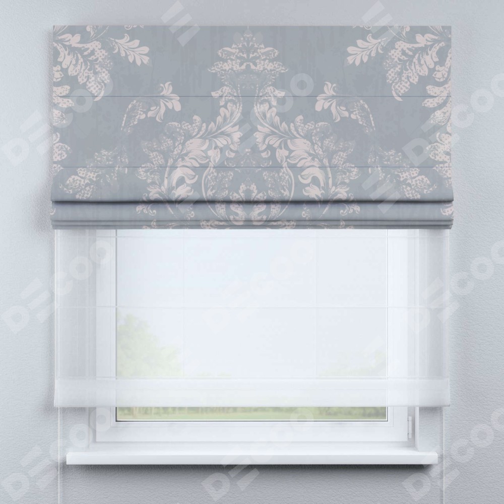 Римская штора день-ночь производителя «Cortin», используется для проёма, пошита из двух полотен, с лицевой блэкаут с нанесением сублимационной печати «Винтажный узор серый», вторая ткань тюль (по стандарту комплектуется тюль белого цвета артикул V-01). Имеет универсальный механизм и подходит для монтажа: на потолок, на стену и в нишу.
